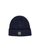 Navy blue ribbed Geelong wool beanie with logo patch.