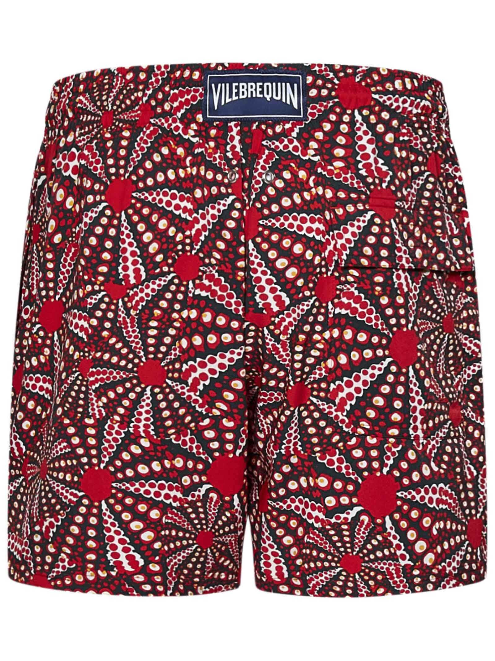 Moorise red stretch fabric swim shorts with all-over graphic print.
