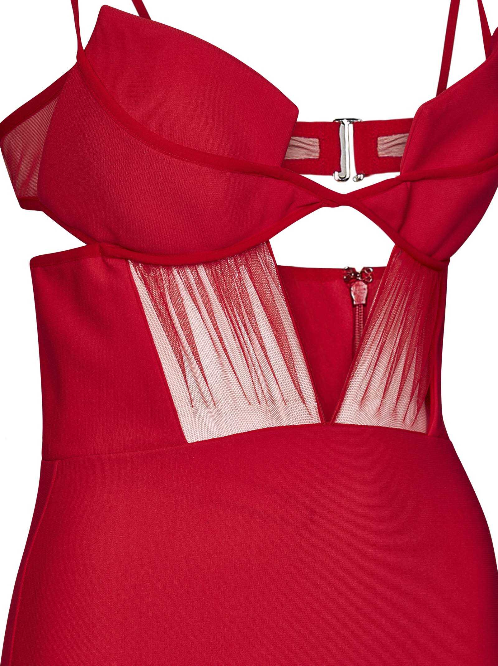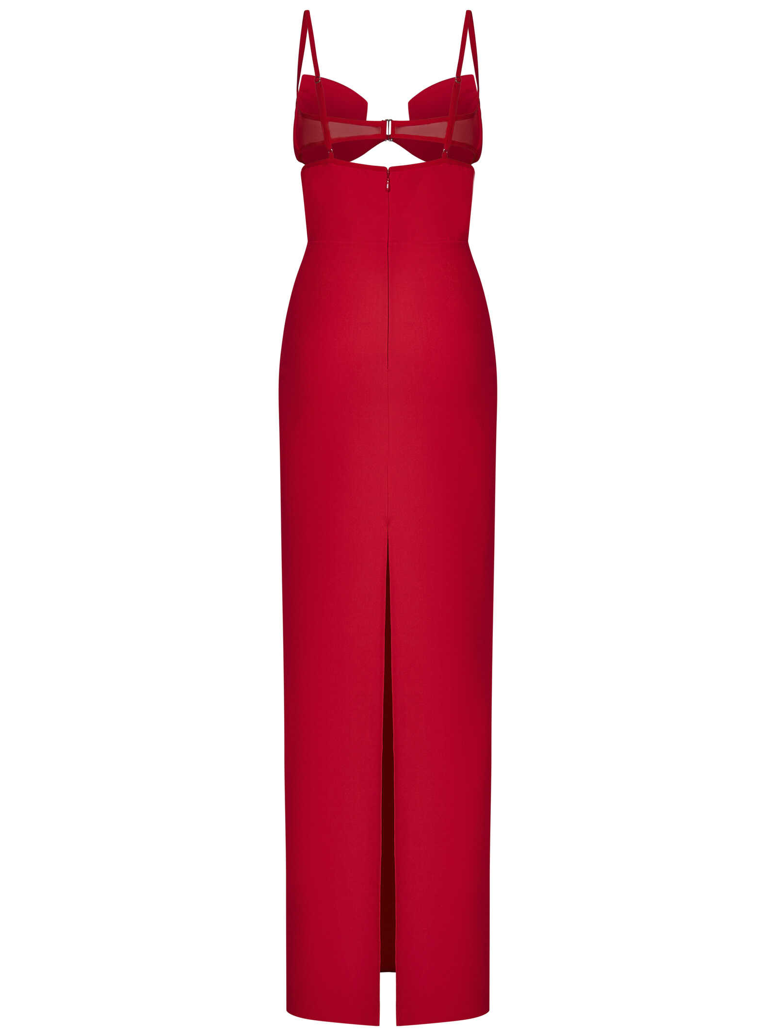 Long red dress in stretch viscose with tulle insert at the waist and cut-outs on the chest.