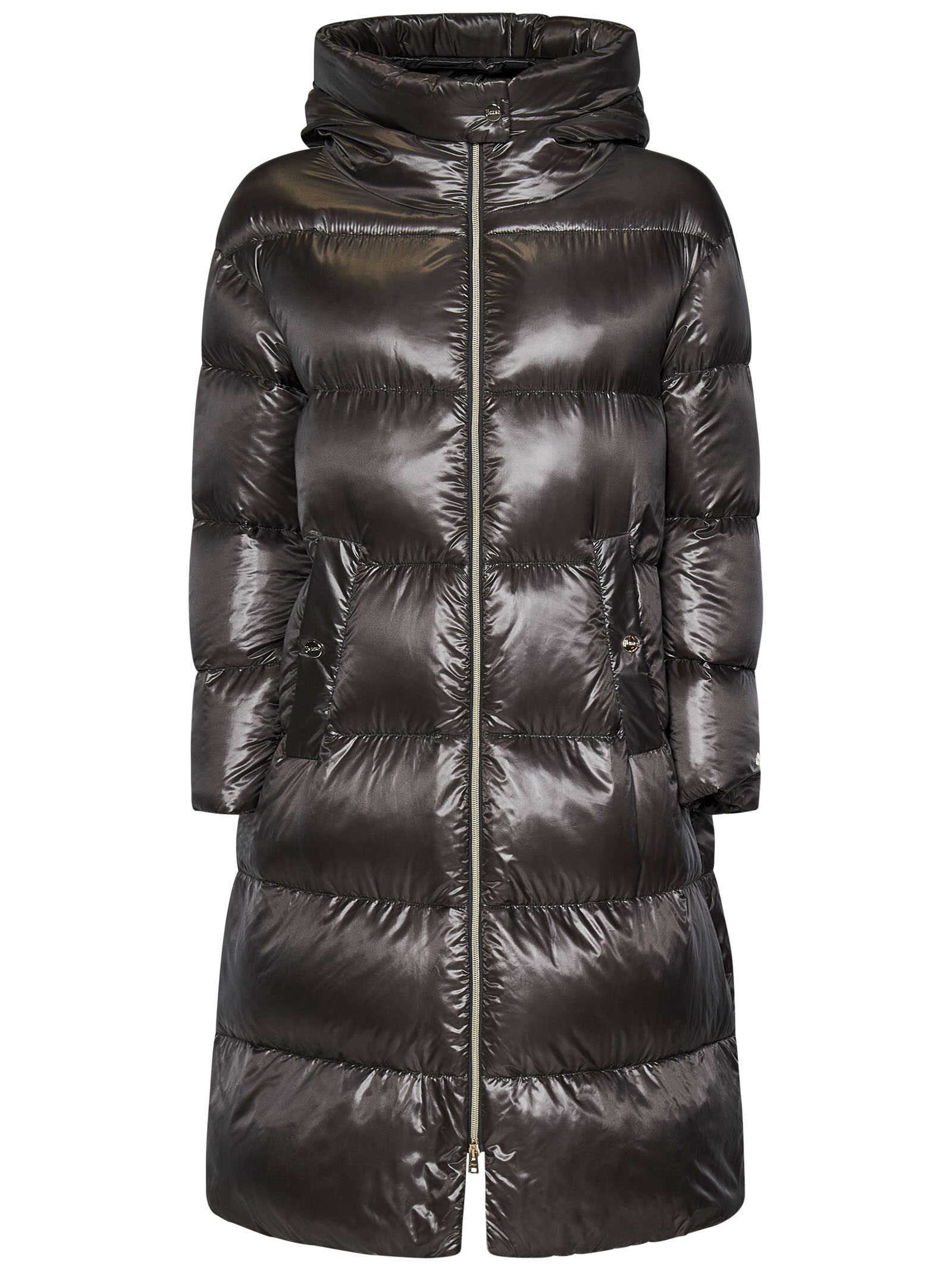 Ultralight nylon midi down jacket in grey with crater collar and hood.