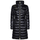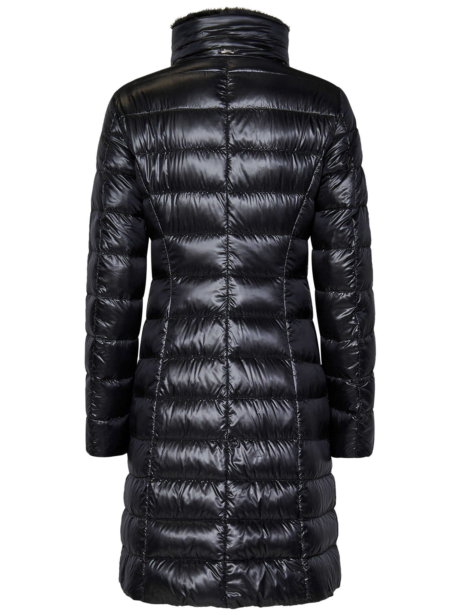 Black quilted nylon midi down jacket with tone-on-tone faux fur collar.
