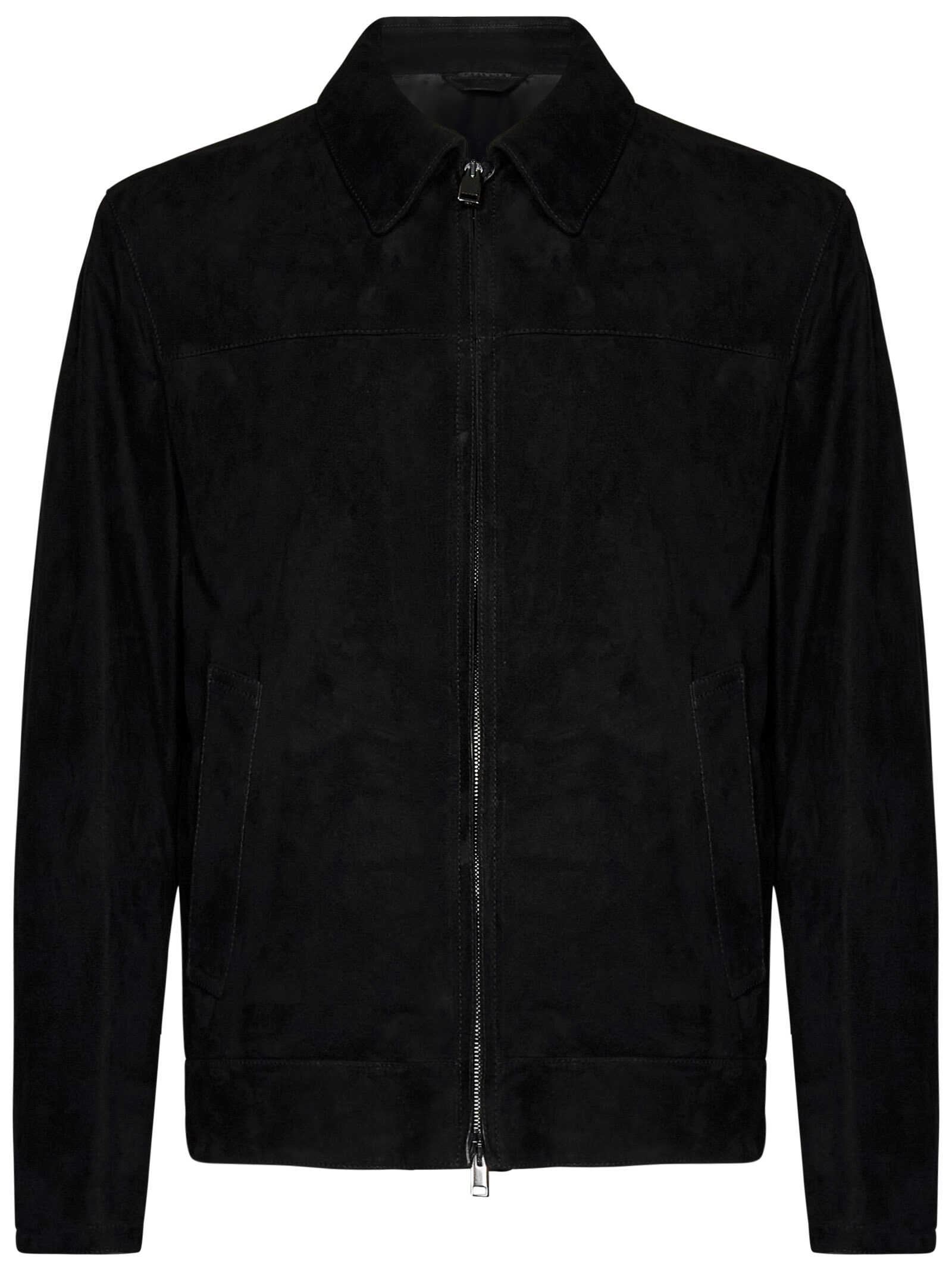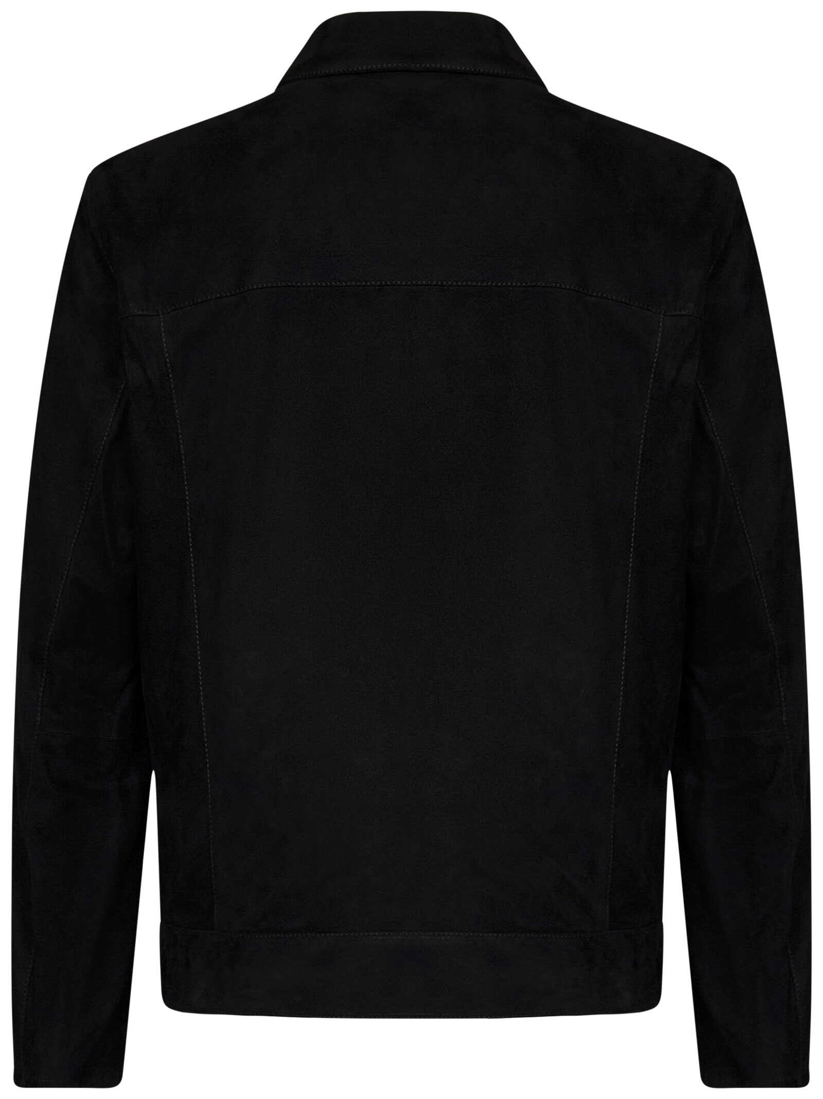 Black suede lambskin jacket with shirt collar.