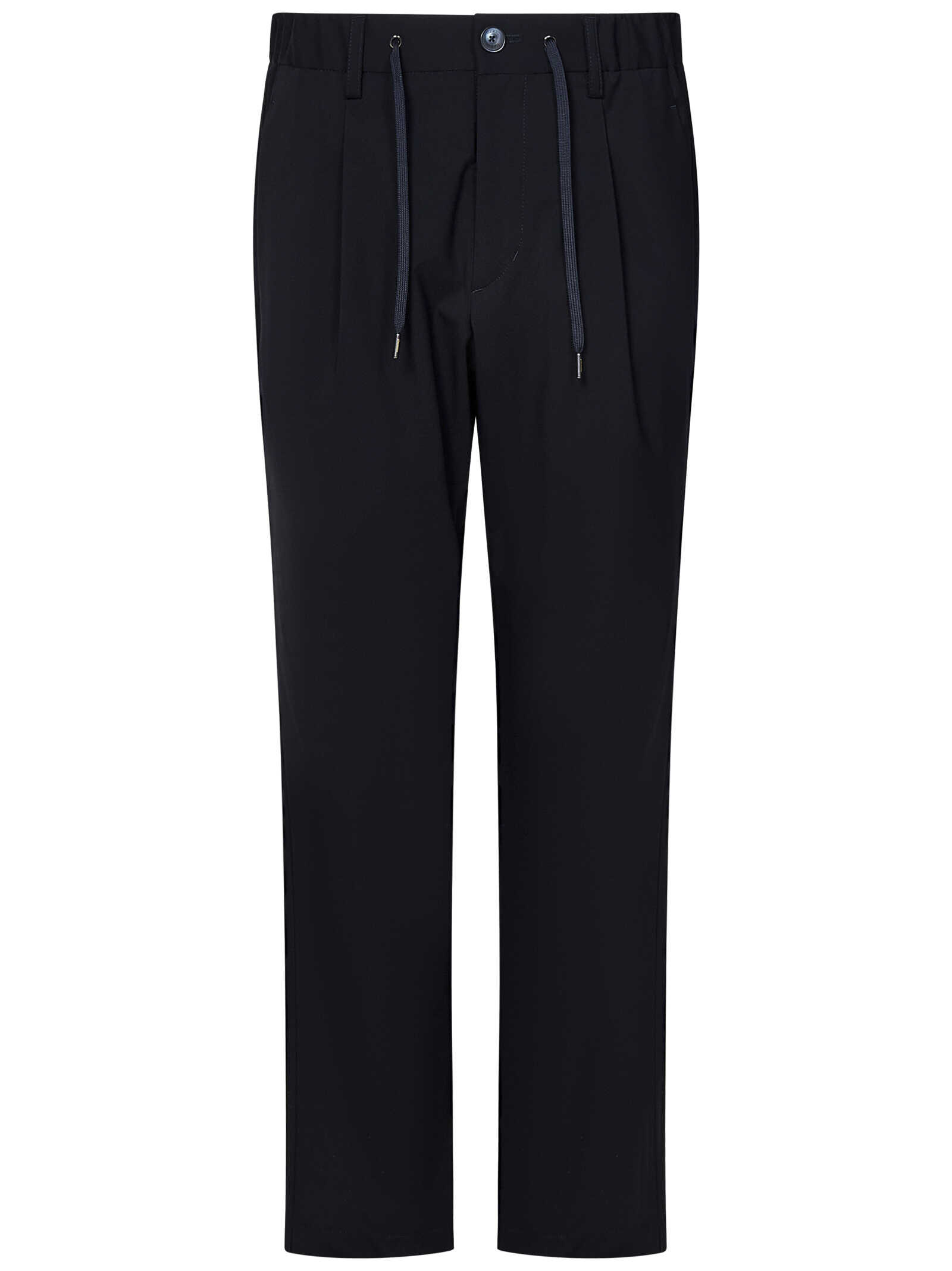 Navy blue straight leg trousers with drawstring waist and silver logo plaque on the back.