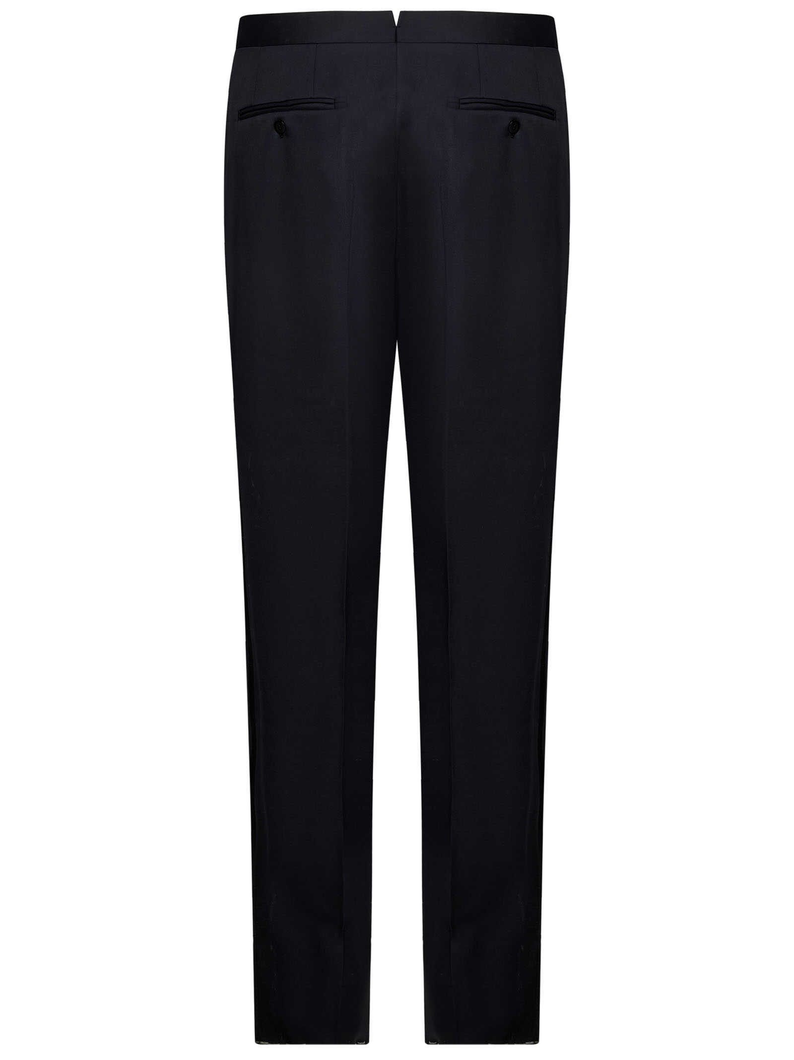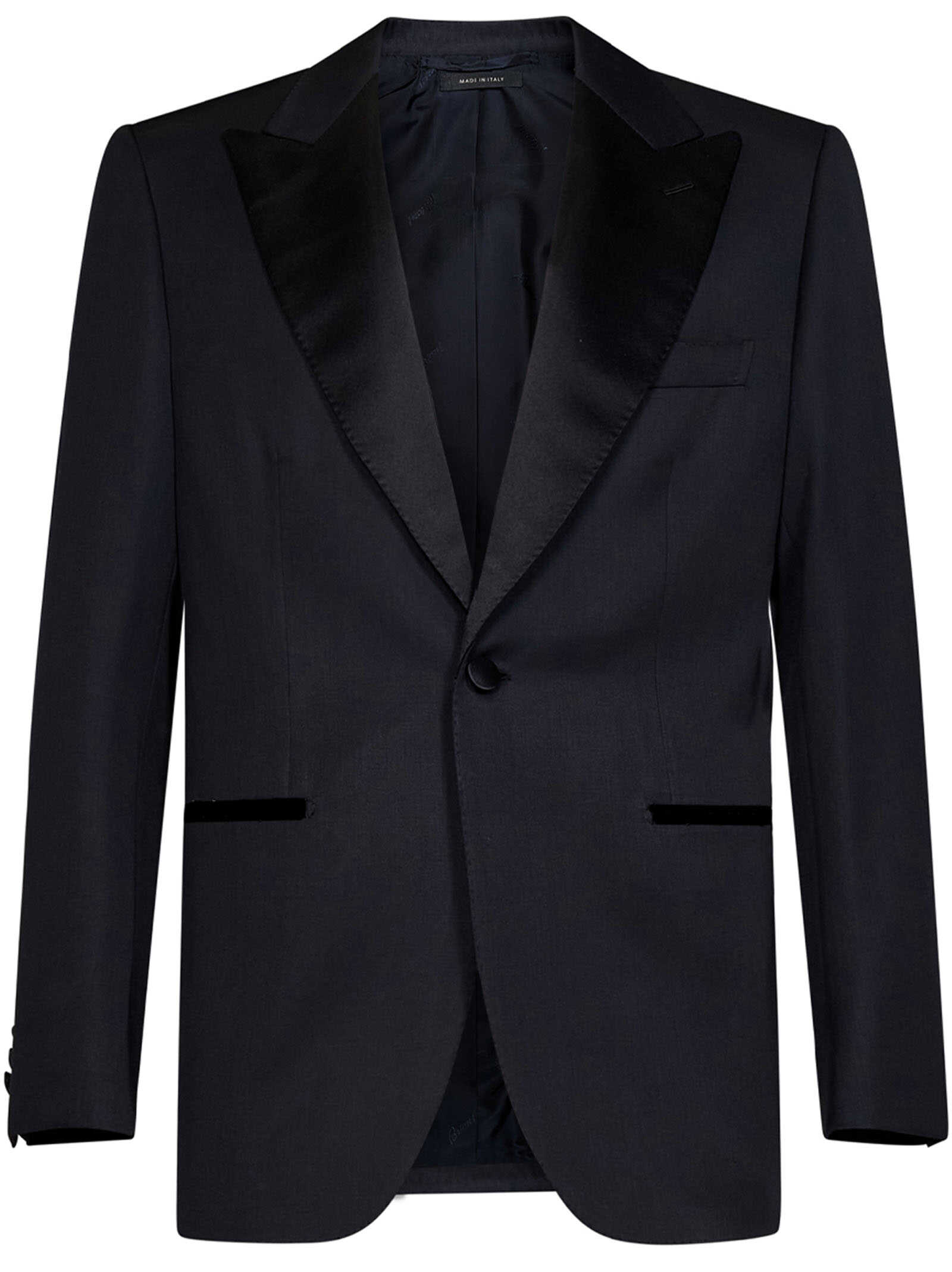 Blue virgin wool tuxedo suit with single-breasted blazer and silk satin details.