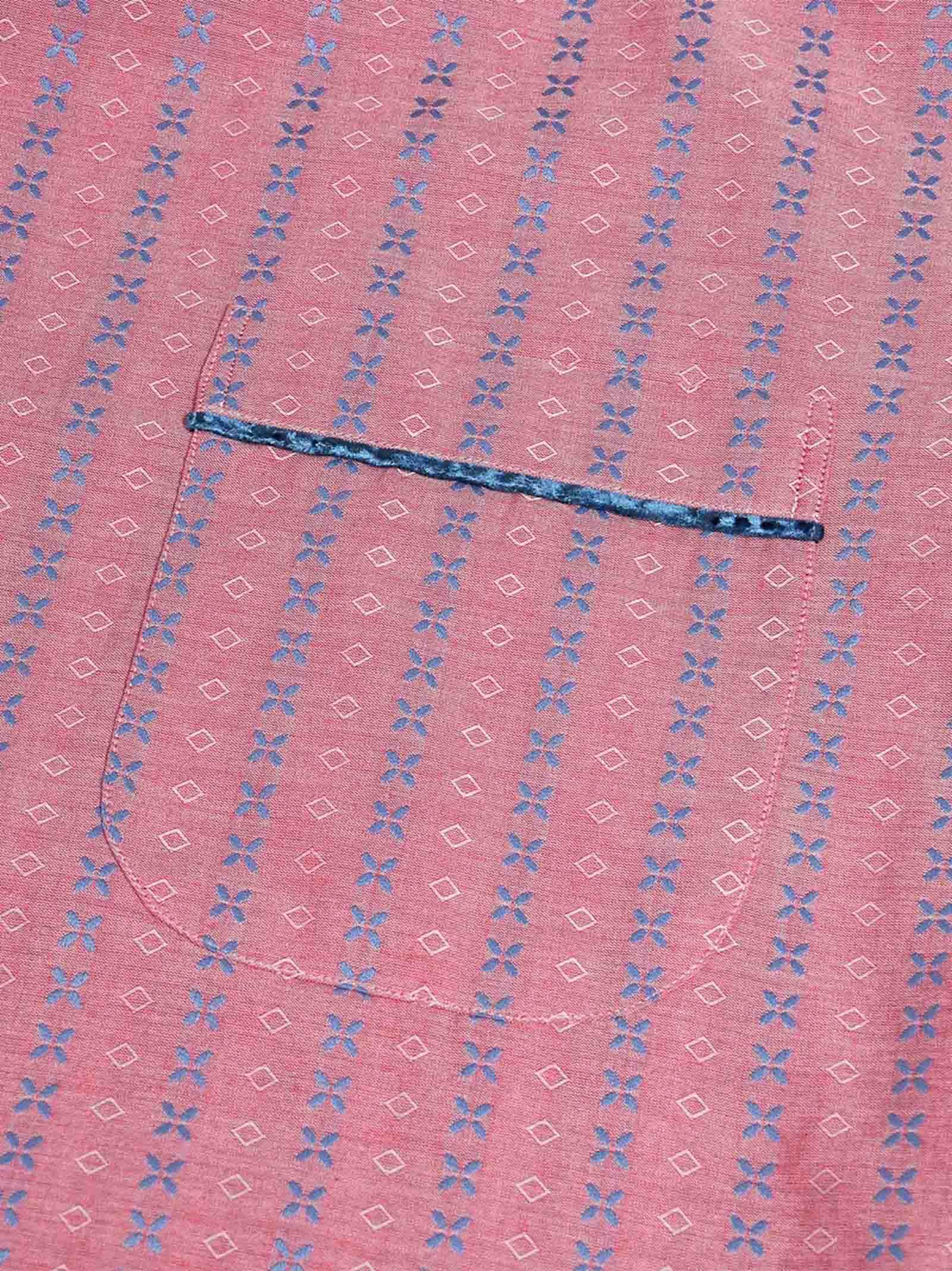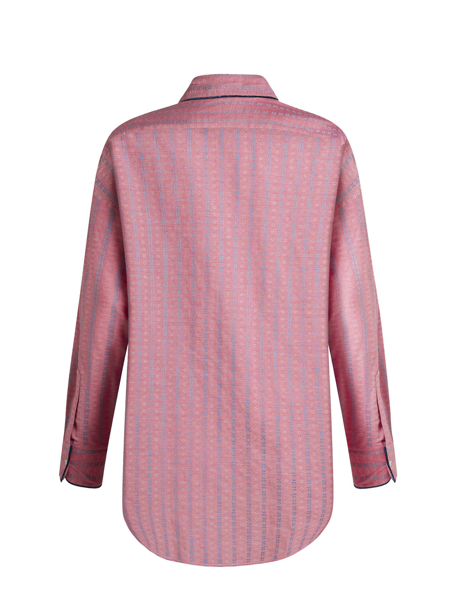 Oversized pink jacquard cotton shirt with geometric motif and velvet piping.