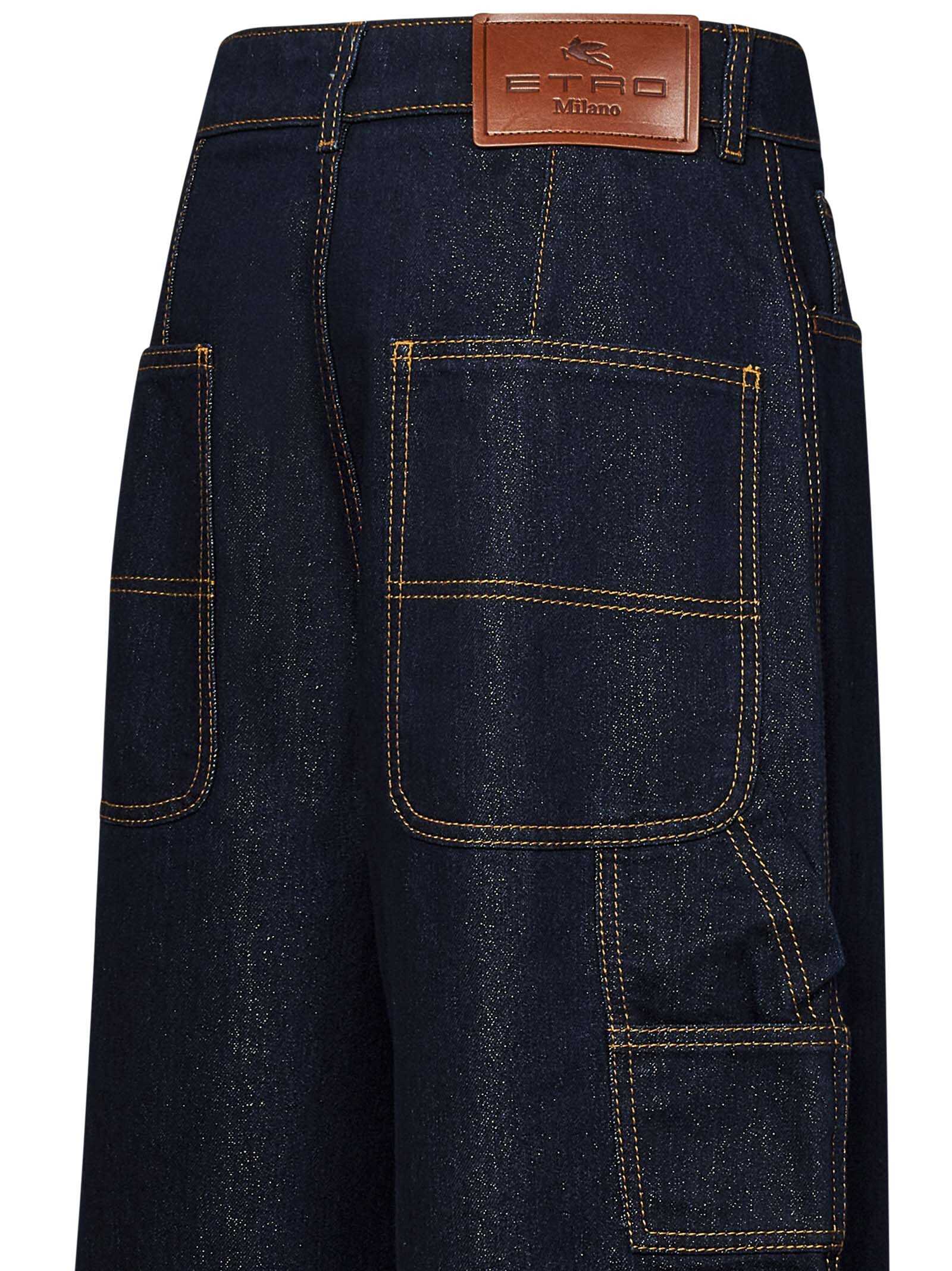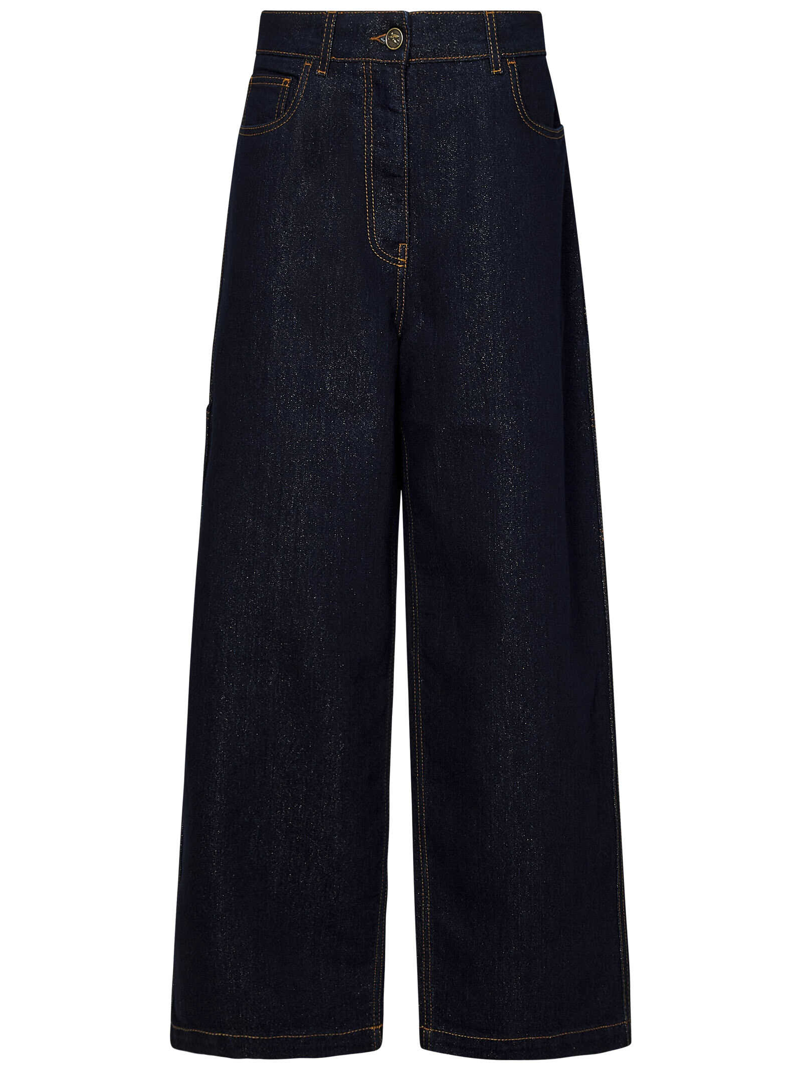 Dark blue lurex denim high-waisted baggy jeans with leather back patch.