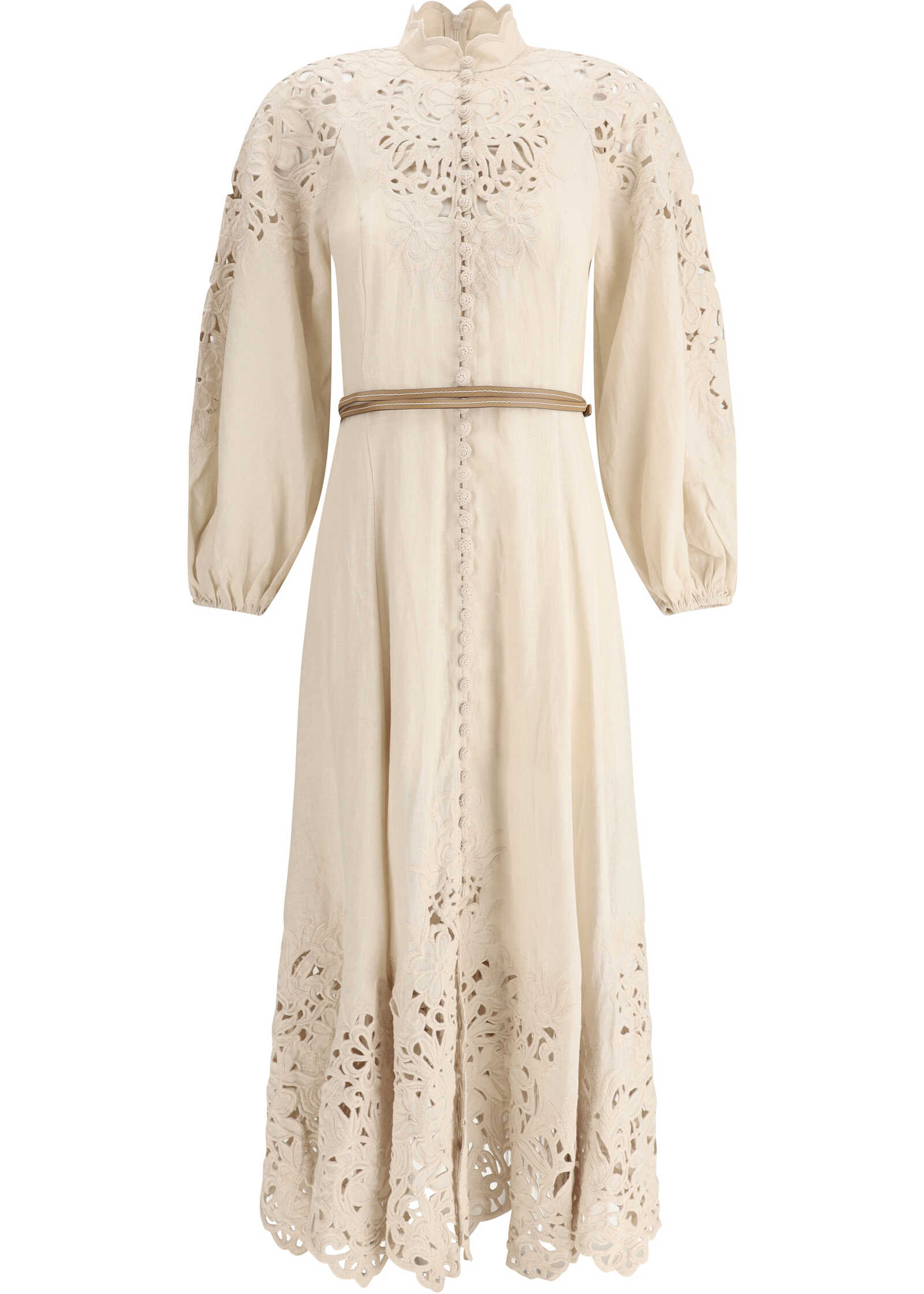 Wylie Linen Long Dress by Zimmerman, high lace collar, front closure by crochet buttons, balloon sleeves with elastic cuffs with lace detail, knotted and adjustable leather belt at waist, belt loops at waist, lace hem, monochrome pattern, regular fit.
