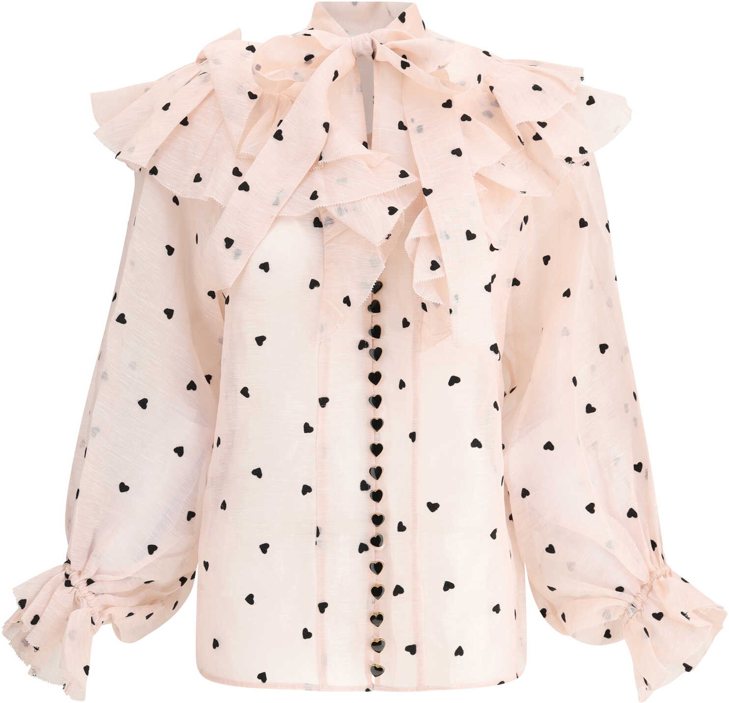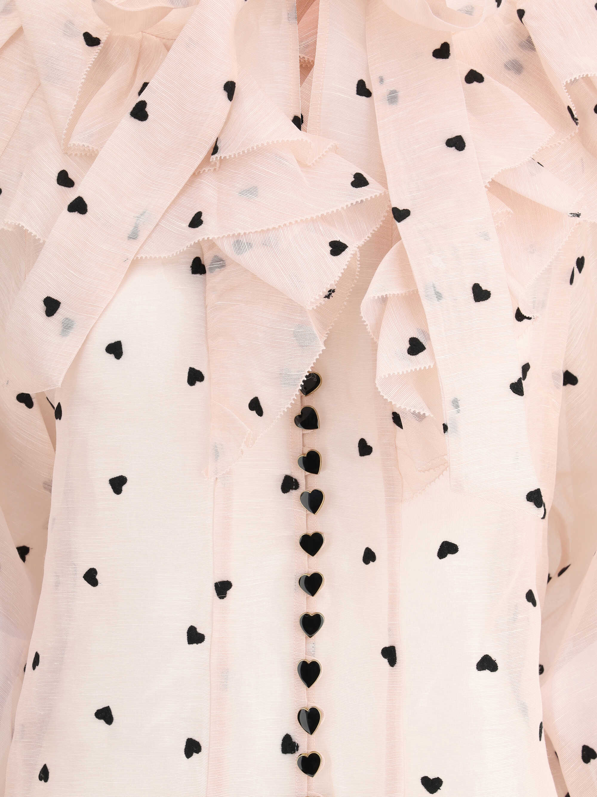 Linen and Silk Crush Blouse by Zimmerman featuring a V-neck, front closure using heart-shaped buttons, semi-sheer design, balloon sleeves with elasticated ruffled cuffs, shoulders featuring ruffles, matching fabric tie at neck, all-over heart pattern, regular fit.