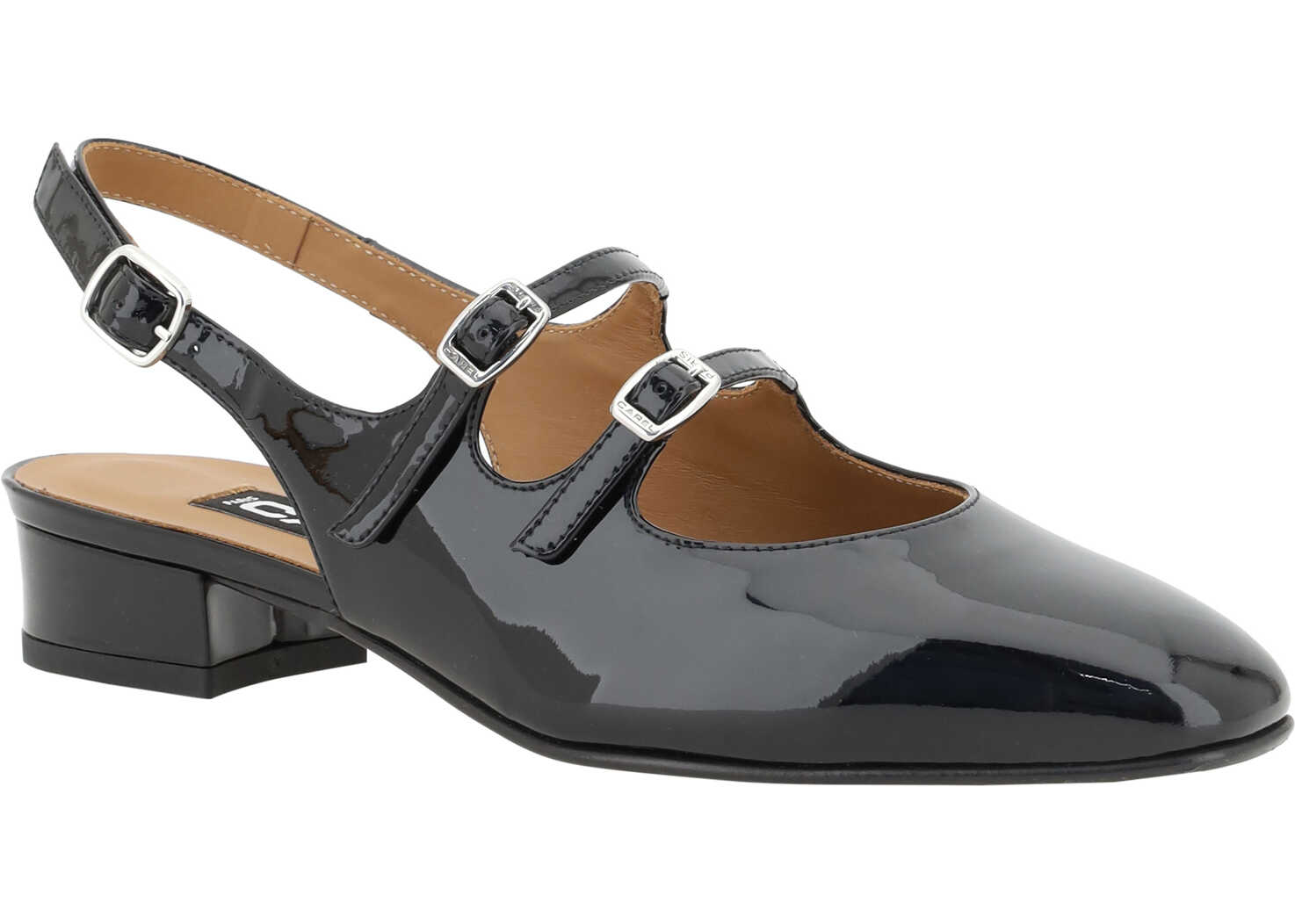 Leather Peche Pumps by Carel Paris, patent leather design, almond toe on front, multiple and adjustable straps on back of foot, adjustable buckle strap around ankle, leather chunky heel, logoed insole.