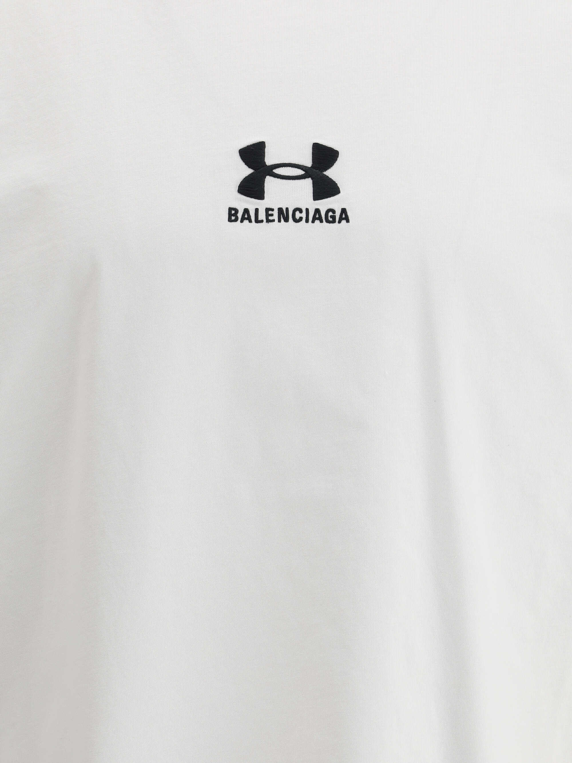 Cotton T-Shirt by Balenciaga, ribbed crew neck, contrasting iconic brand logo on front, monochrome pattern, oversize fit.