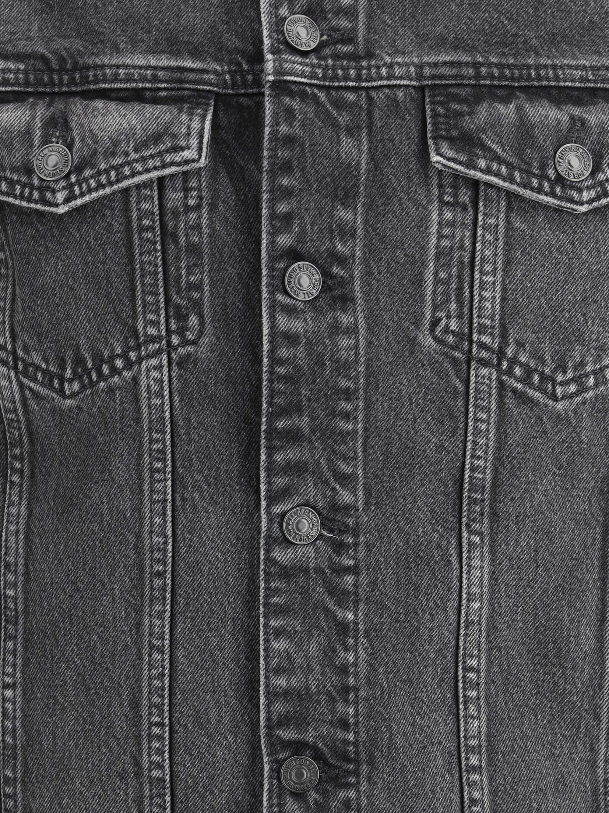 Cotton Perfect Koto Denim Jacket by 7For, classic collar, front button closure, two welt flap pockets on front, two side slit pockets, monochrome pattern, regular fit.