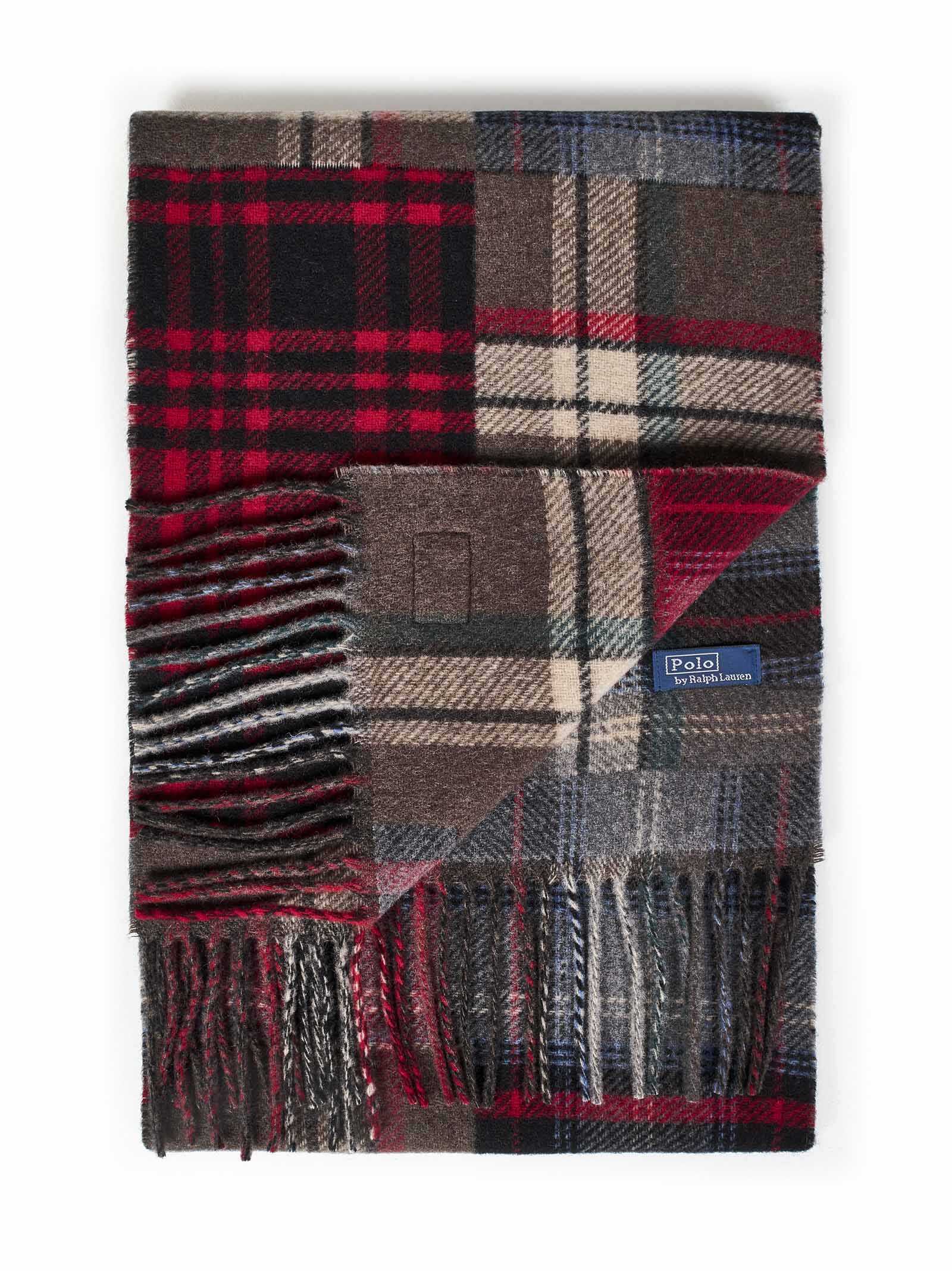 Red and brown wool scarf with patch work effect tartan pattern and leather patch.