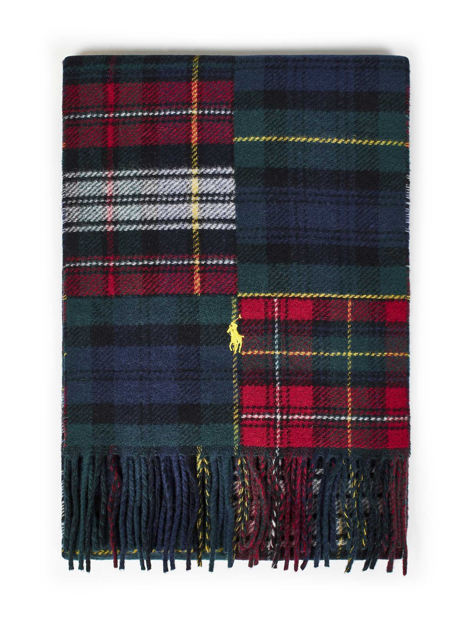 Red, blue and green wool scarf with patchwork effect tartan motif and pony logo embroidery.
