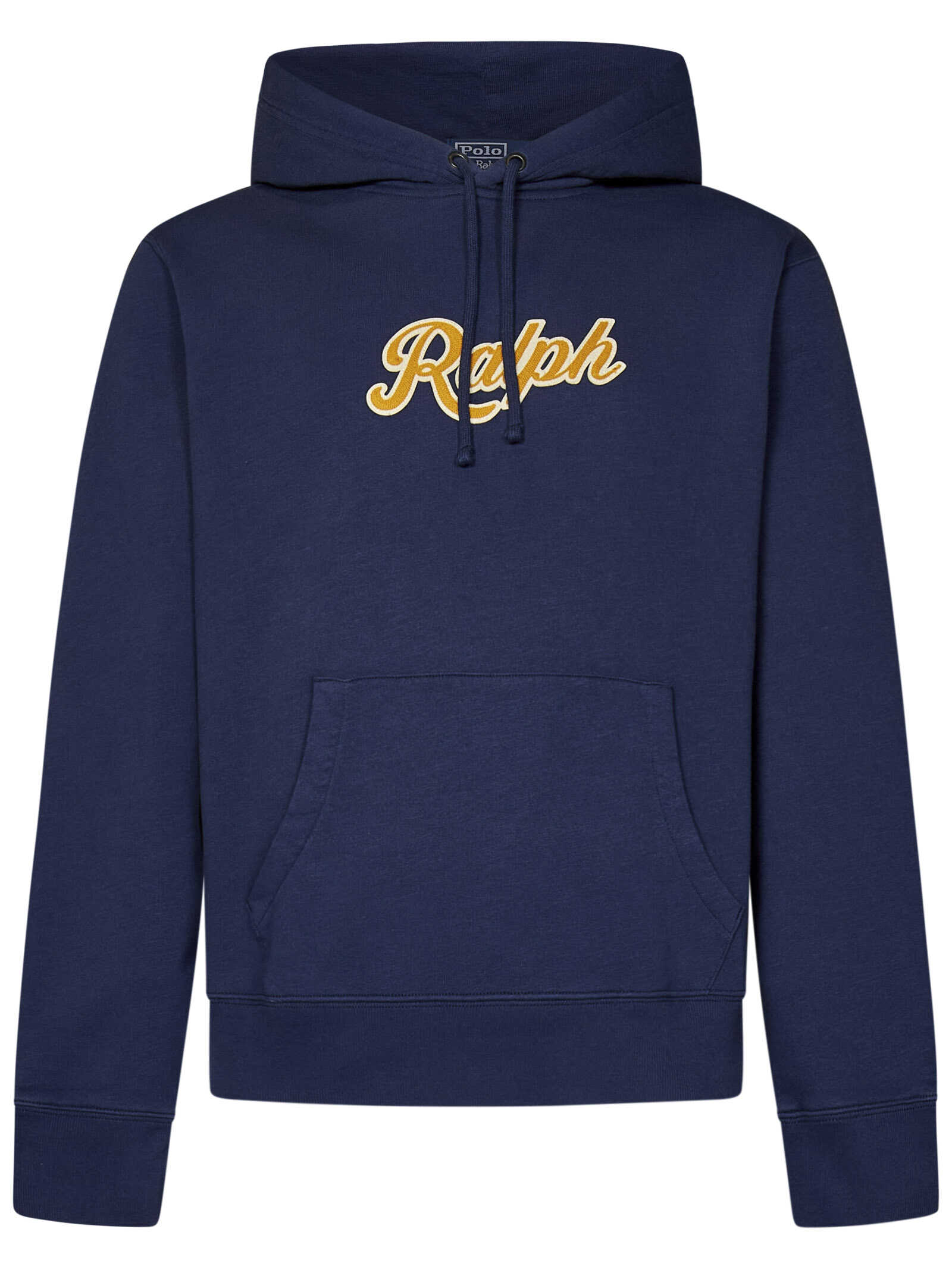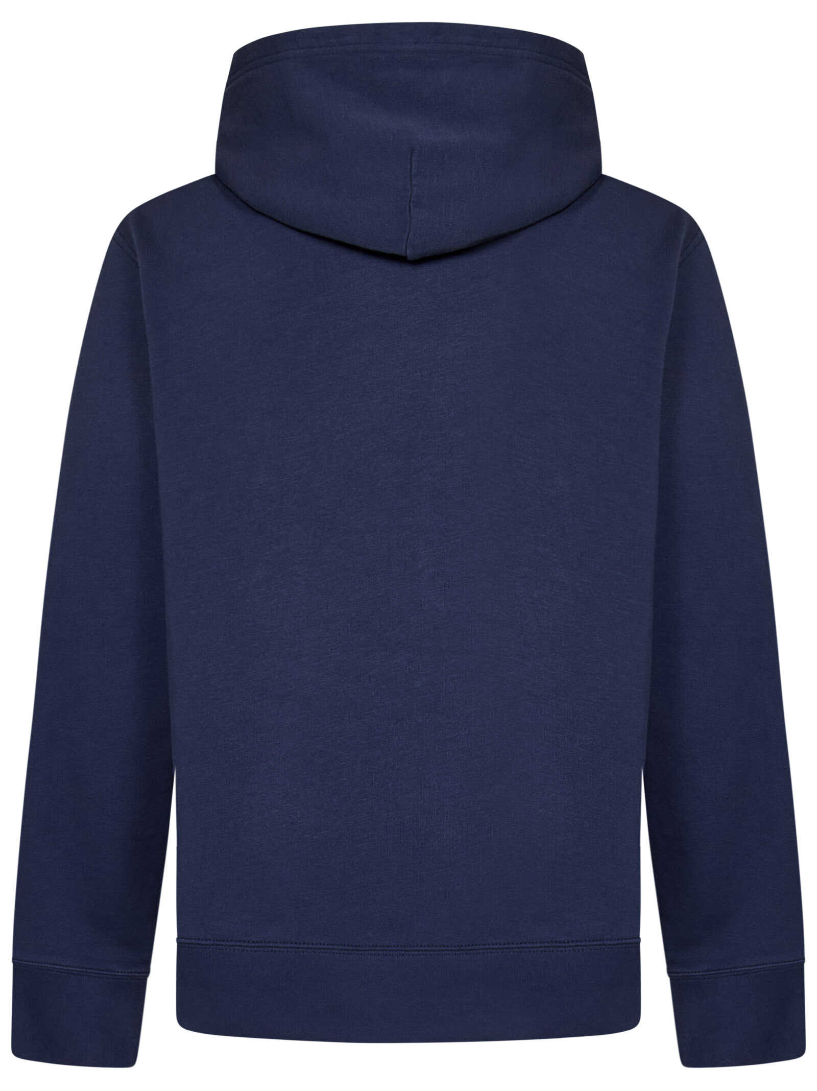 Blue cotton hoodie with logo patch on the chest.