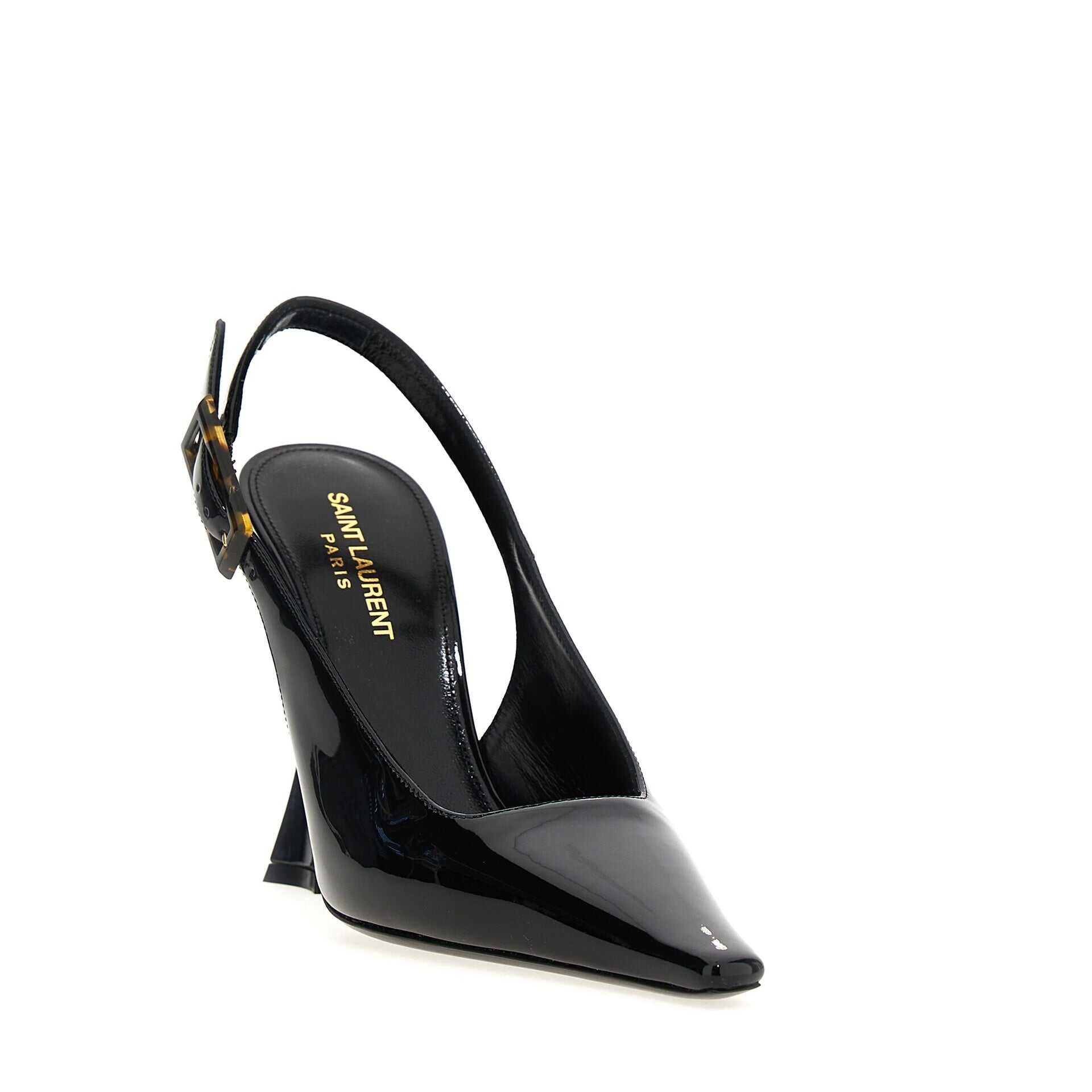 Composition: 100% calf leather, inner: Leather, insole: Leather, sole: Leather, pointed toe, patent effect, branded insole, adjustable ankle strap, flared heel, tortoiseshell buckle