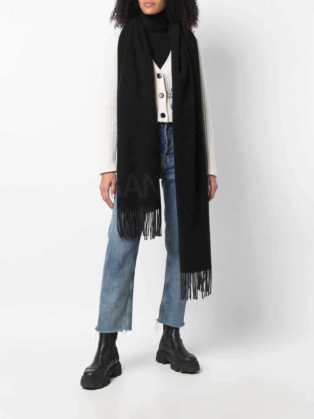 Stay warm and stylish with these luxurious Ganni Black Scarves. Made from 90% Recycled Wool and 10% Wool, these scarves are perfect for any outfit. Elevate your look with this eco-friendly accessory from the renowned brand GANNI.