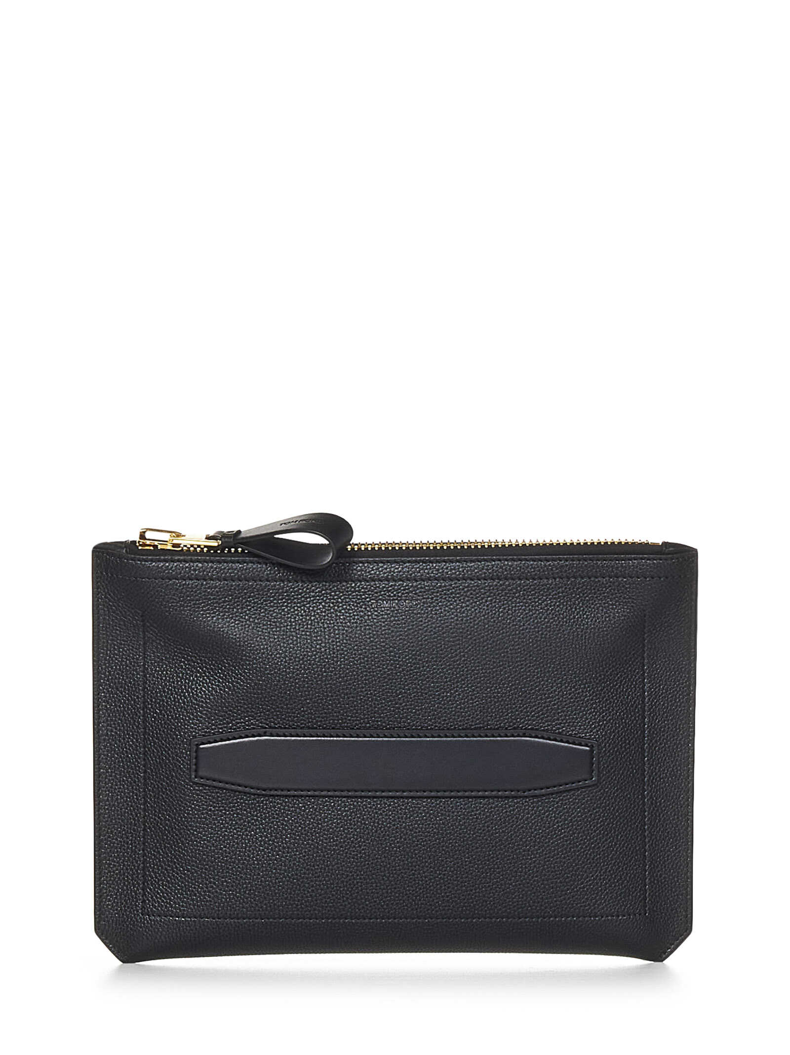 BUCKLEY black grained calf leather clutch with handle detail at front.