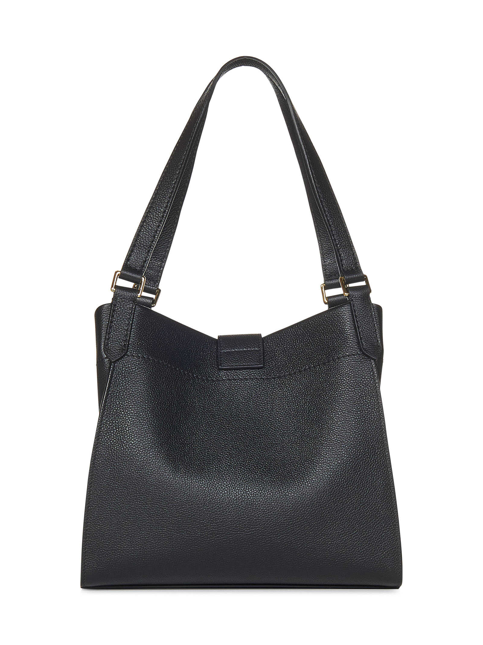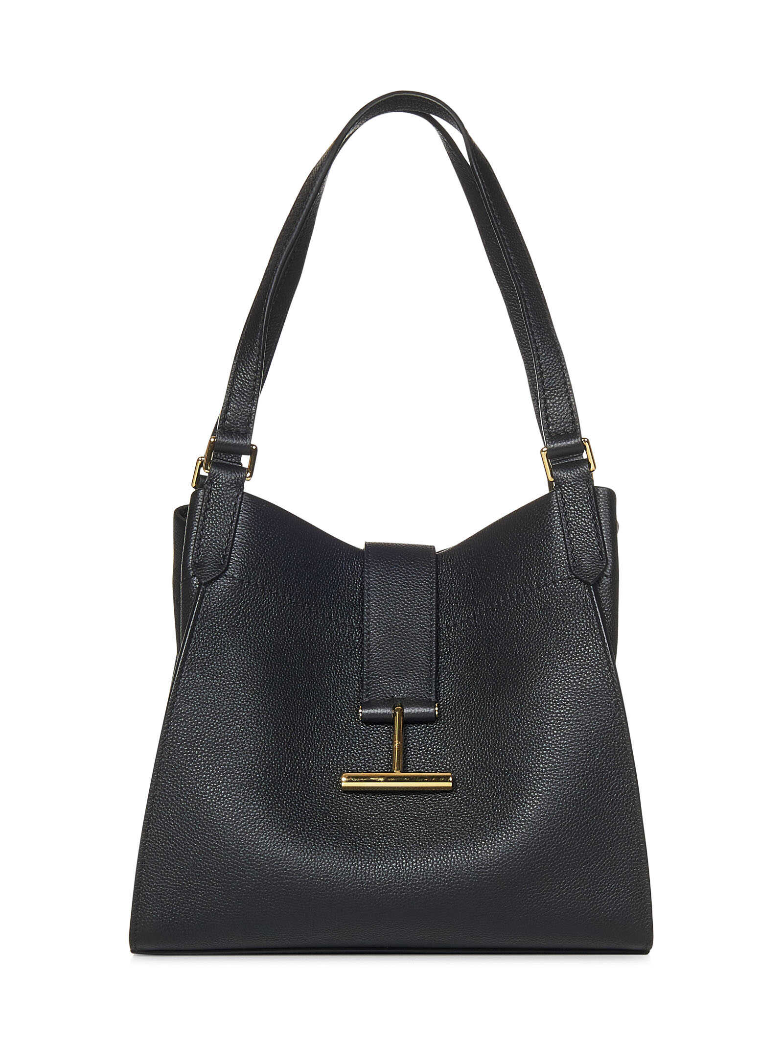 Black grained calf leather TARA MEDIUM tote bag with gold-toned metal T-piece.