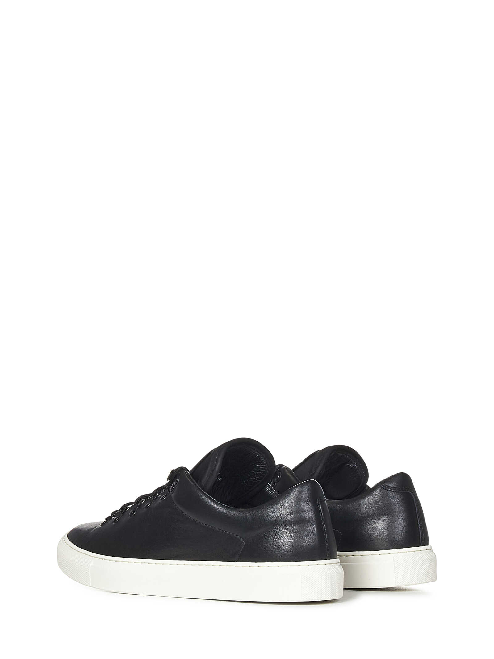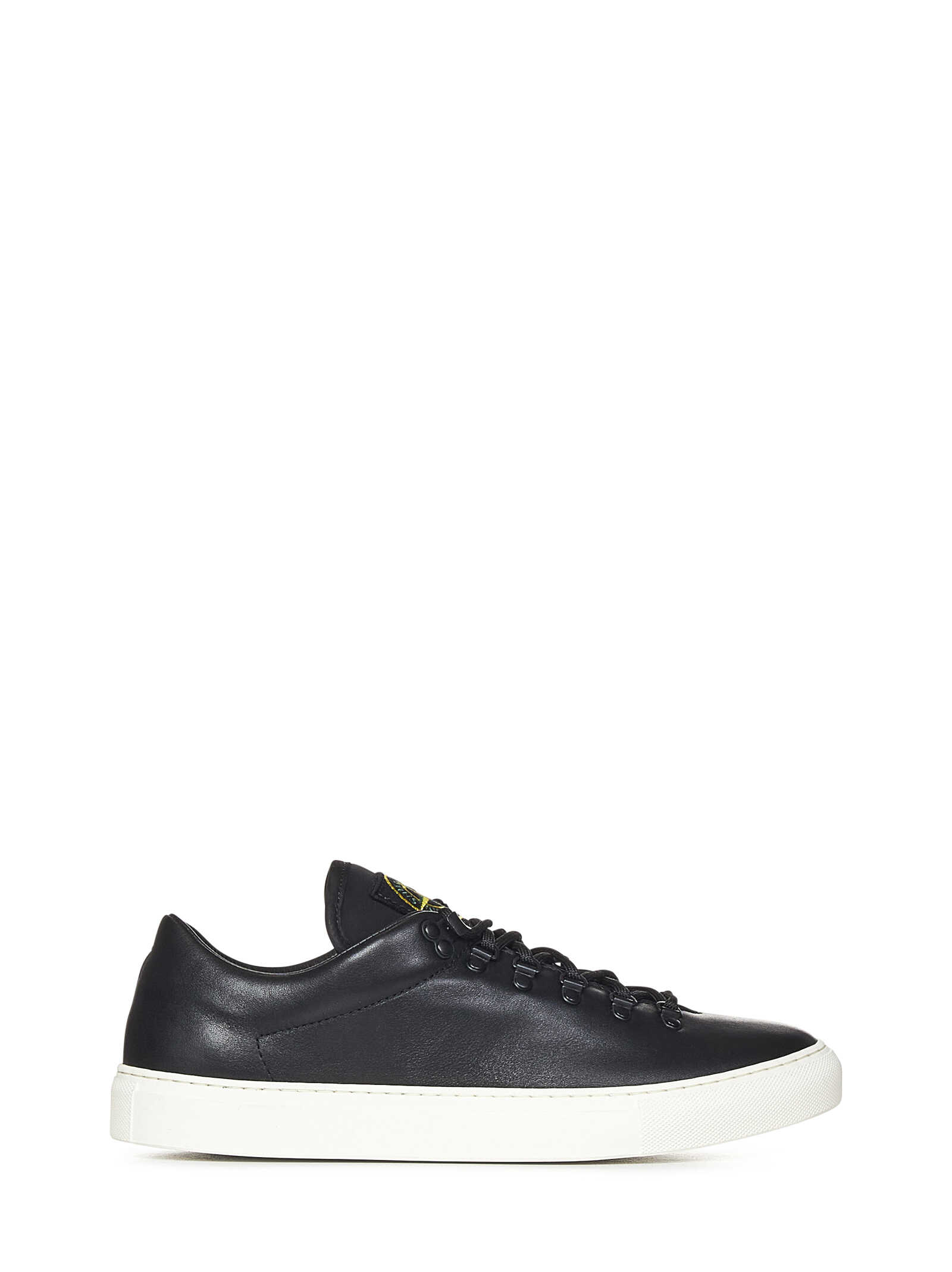Low sneakers in black leather with logo patch on the tongue and white rubber sole.