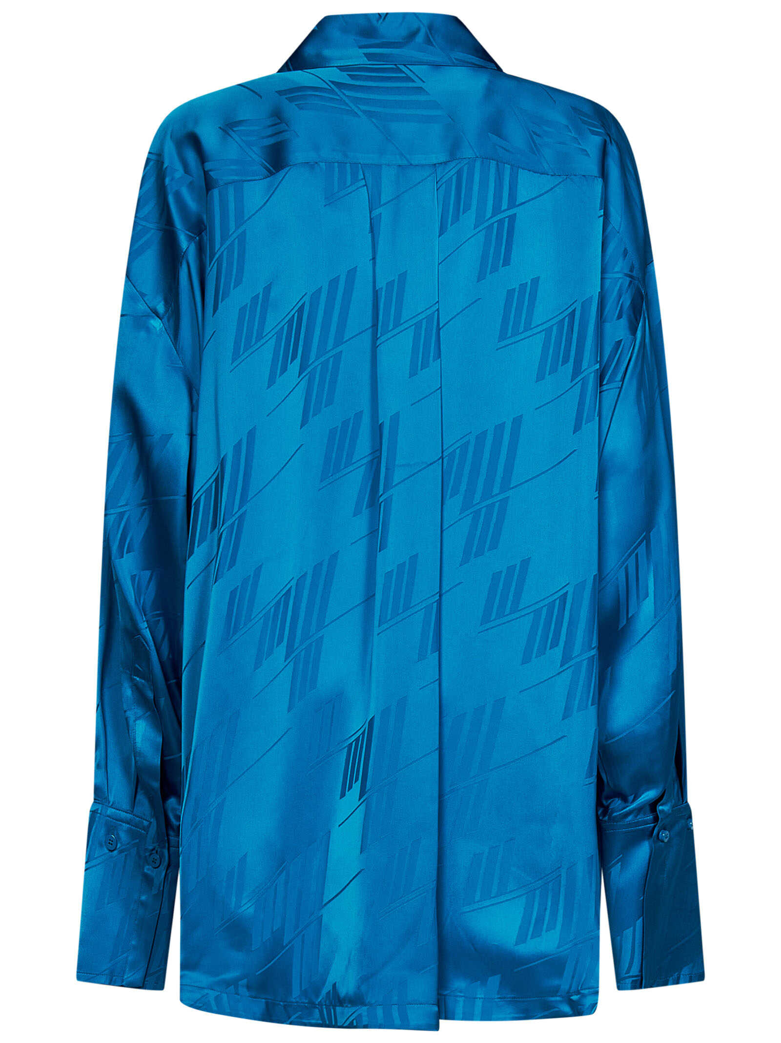 Elevate your wardrobe with this stunning blue 'Diana' shirt from THE ATTICO. Made with 100% viscose, this fluid satin shirt is beautifully crafted with an all-over jacquard logo and shaped vent. Perfect for any occasion, this shirt is a must-have for any fashion-forward woman. Shop now and make a statement in The Attico Shirts Blue!
