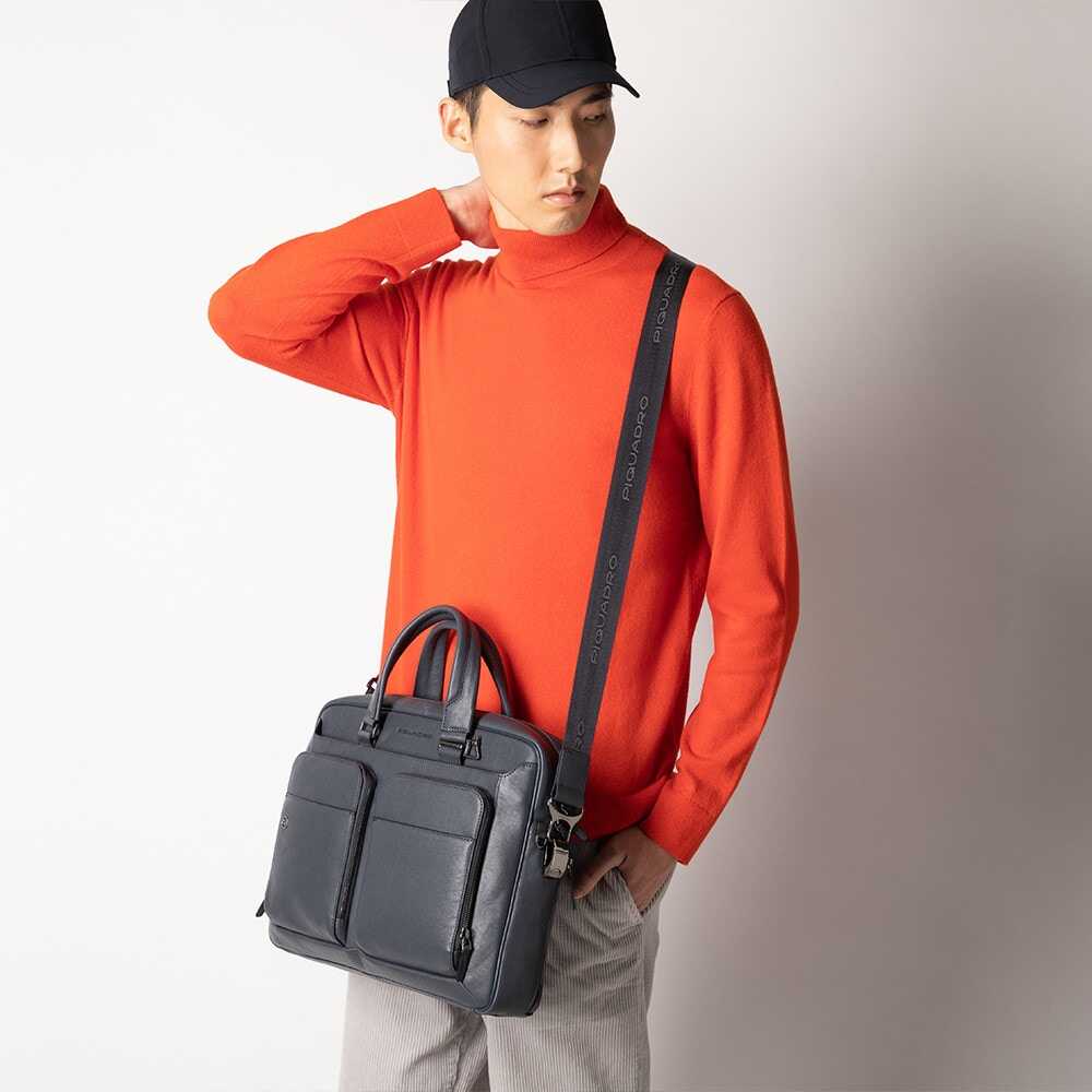 Be effortlessly stylish with the Workbook by Piquadro handbag. Made of 100% leather, this thin bag is perfect for carrying your computer and iPad. With a detachable shoulder strap, external bottle holder pocket, and fixed iPad holder, it's the ultimate accessory for people on-the-go. The bag has a soft construction and features piping for added durability. With a single zip closure and multiple compartments, you can keep your belongings organized and secure. The bag also has a detachable address tag and key holder, making it perfect for travel. Get yours now and elevate your style!