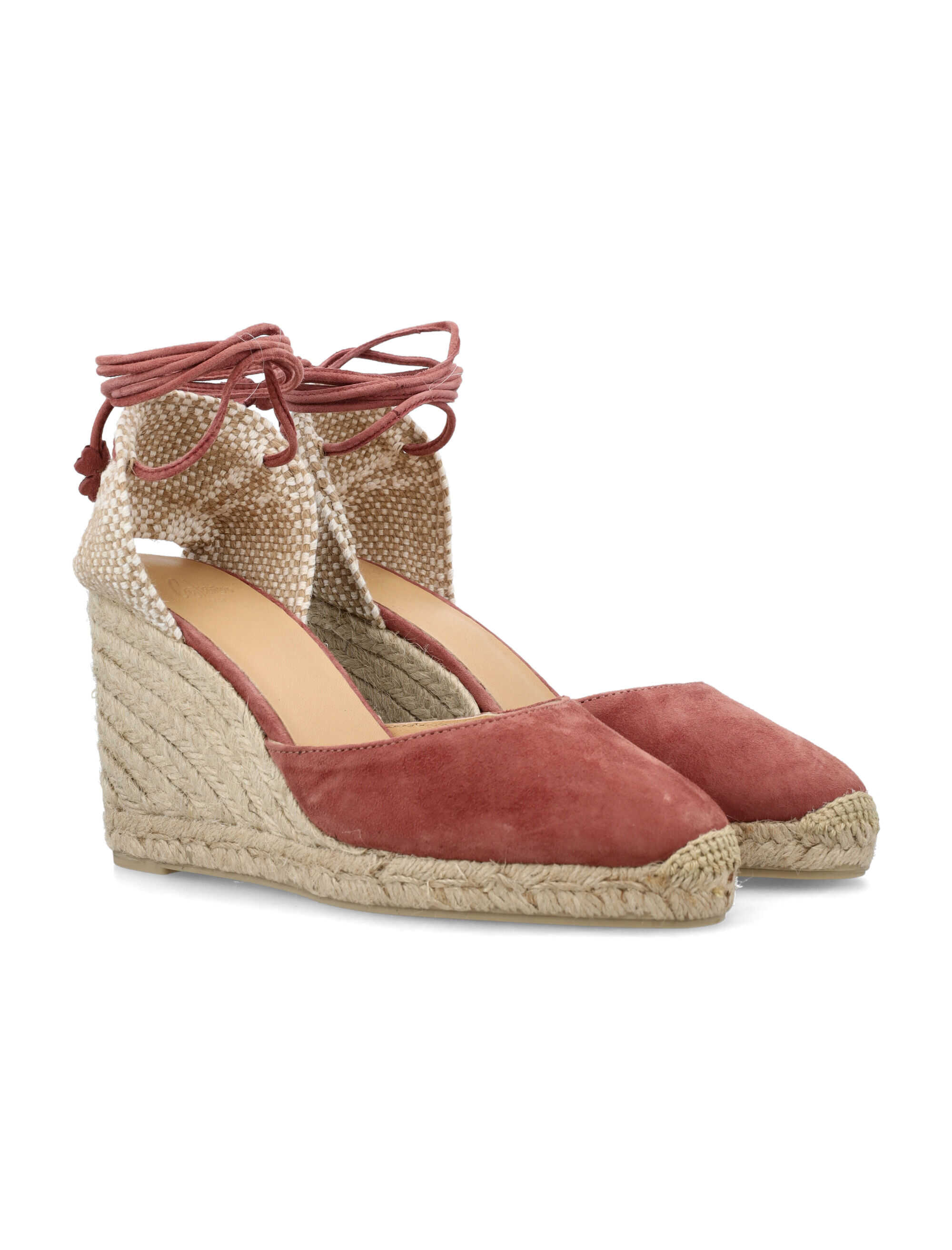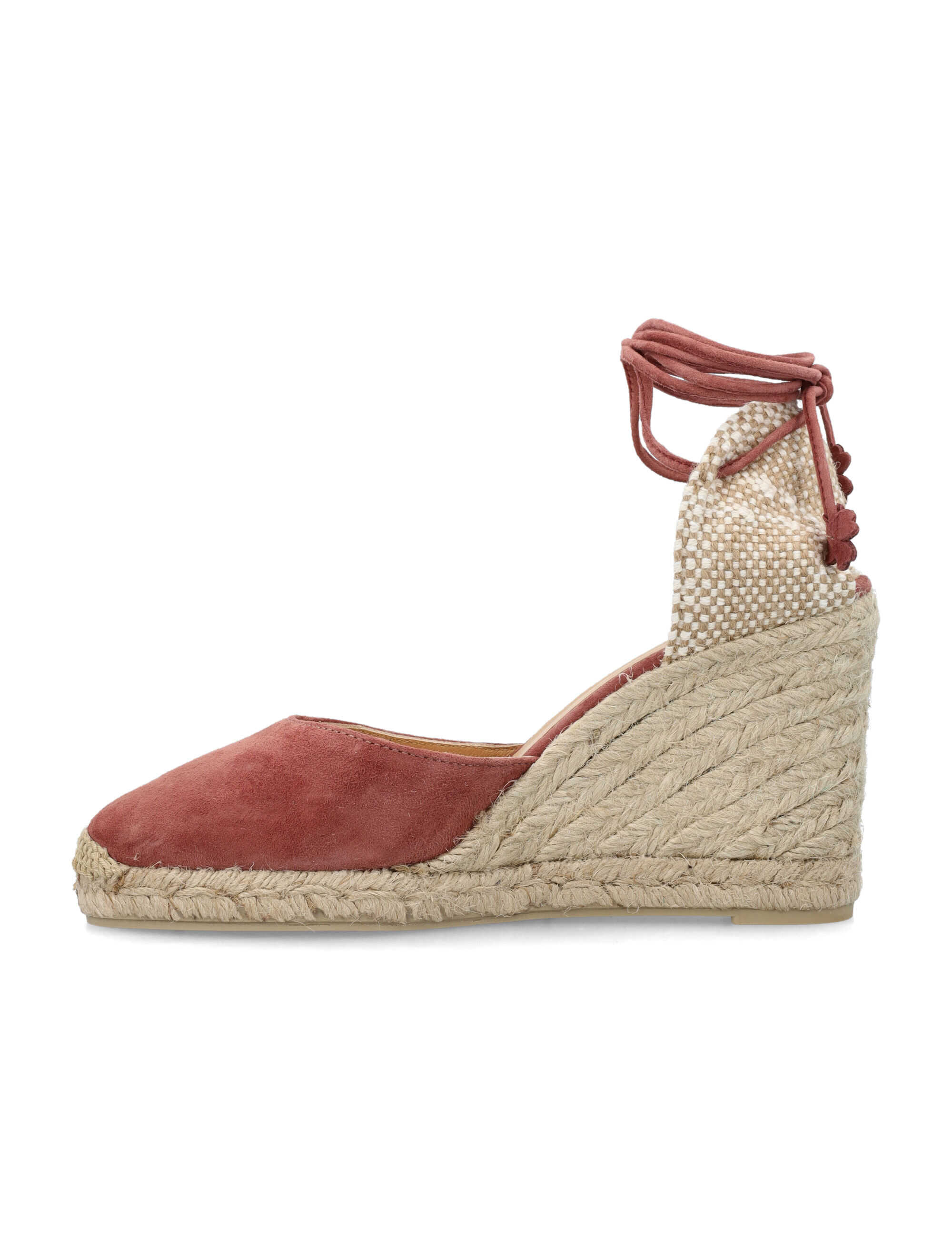 Step into sophistication with these Marsala Rose Carina wedge espadrilles by CASTANER. Crafted from luxurious suede with a tie-fastening ankle strap and braided raffia platform, these shoes will elevate your look effortlessly. Perfect for a day out or a special occasion. Make a statement with every step you take.