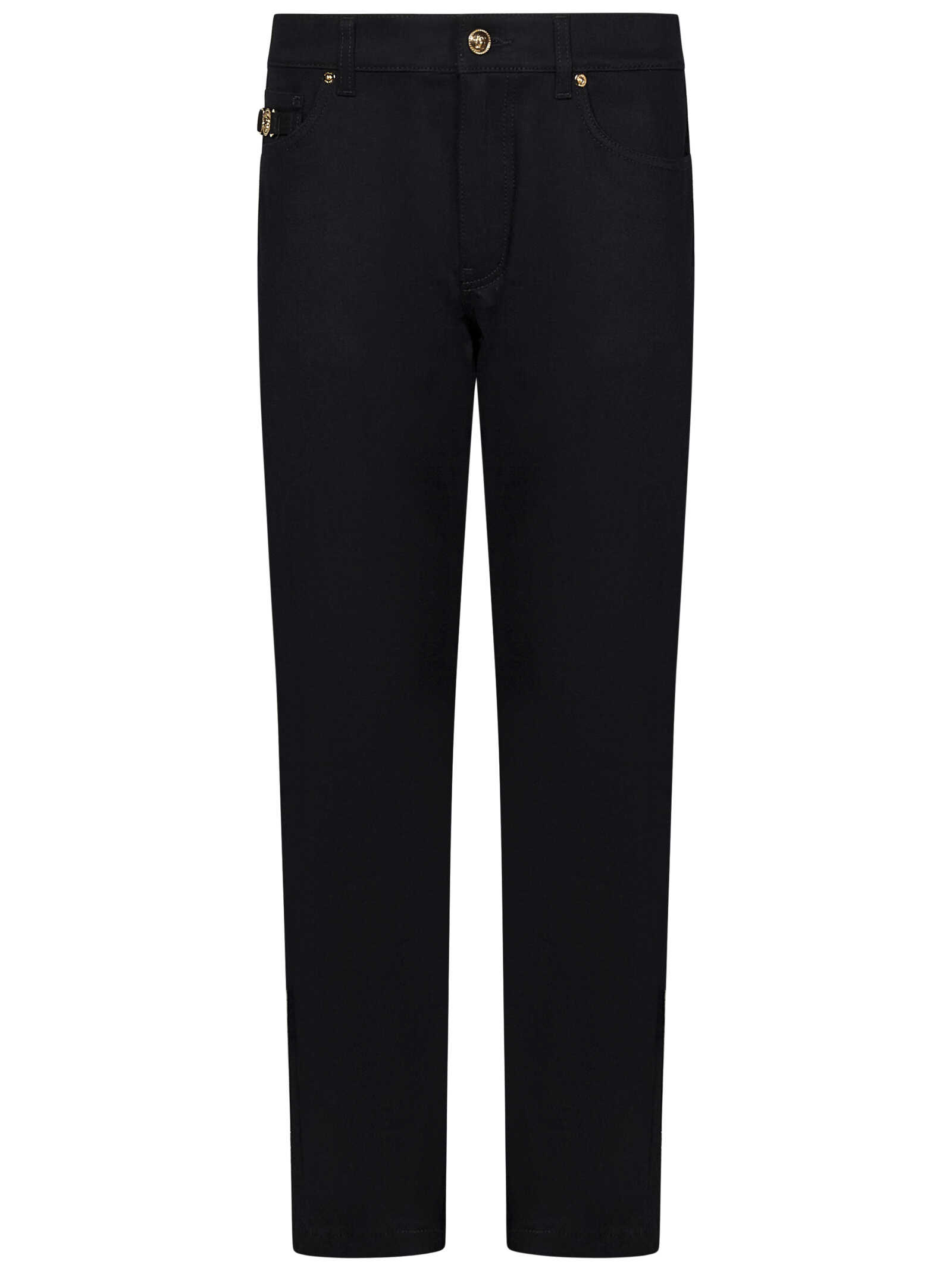 Skinny fit jeans in black stretch denim with gold logo plaque on the fifth pocket.