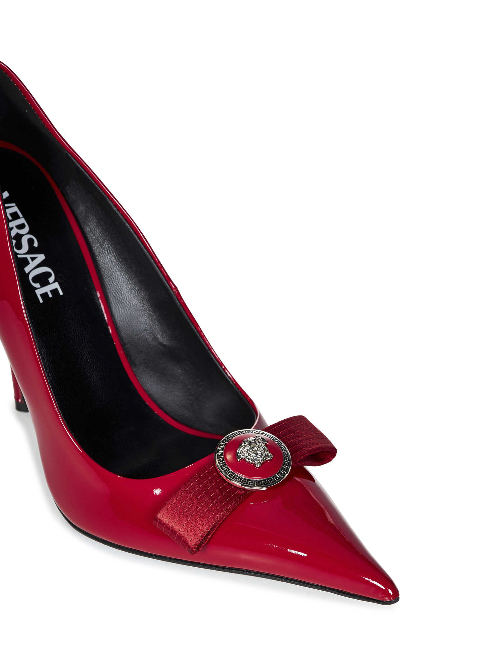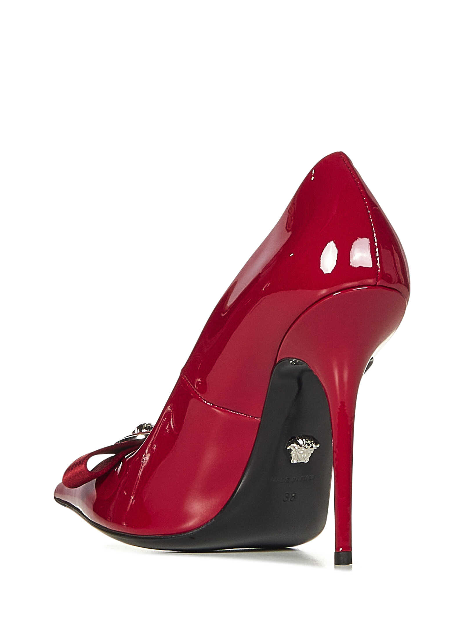 Gianni Ribbon red patent leather pumps with Medusa bow at front and stiletto heel.