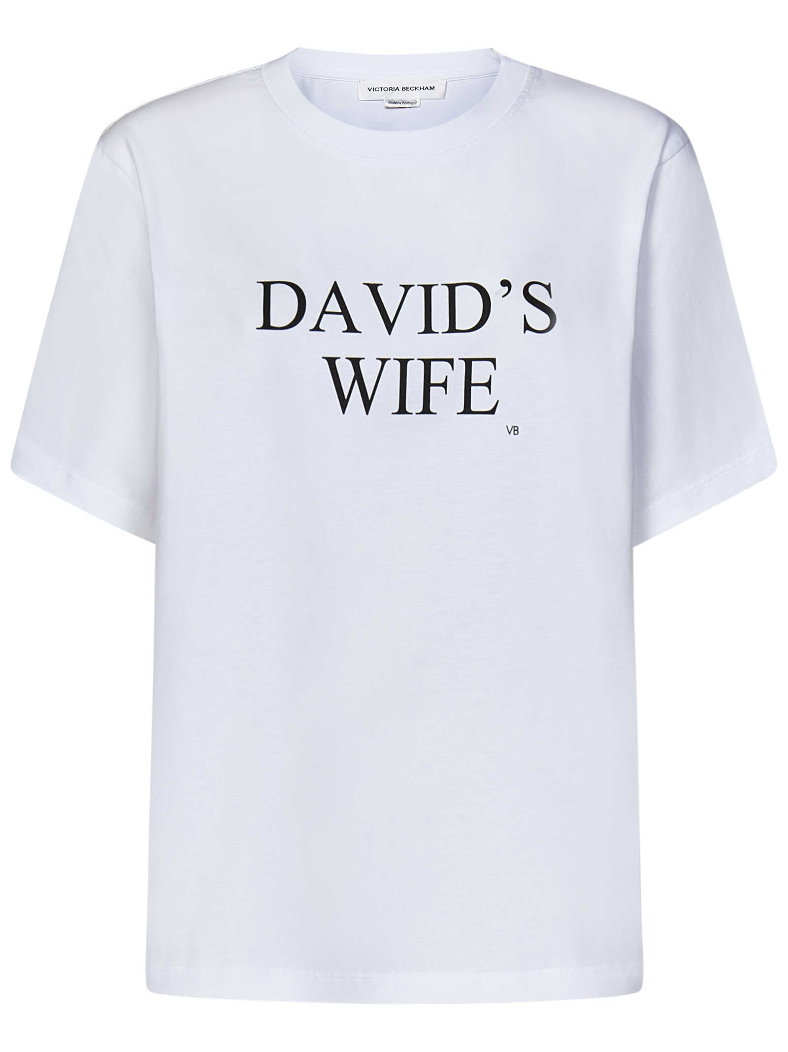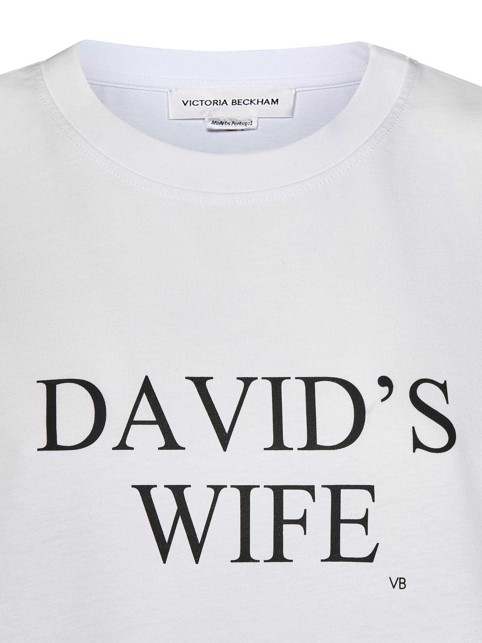 White organic cotton T-shirt with 'DAVID'S WIFE' slogan print on the front.