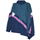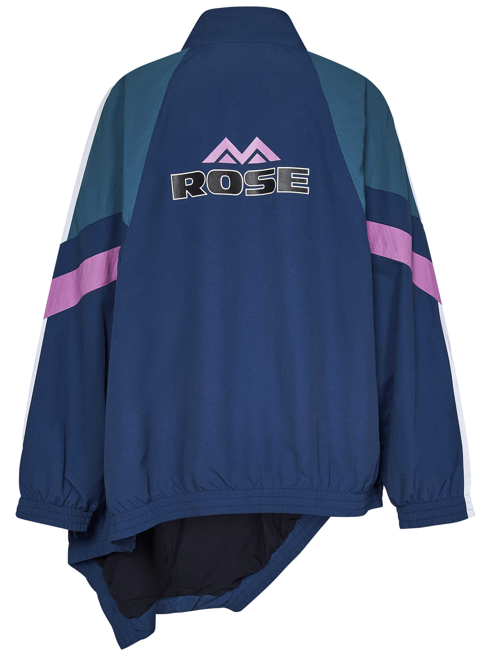 Vintage asymmetric jacket in blue and petrol green nylon with logo print on the back.