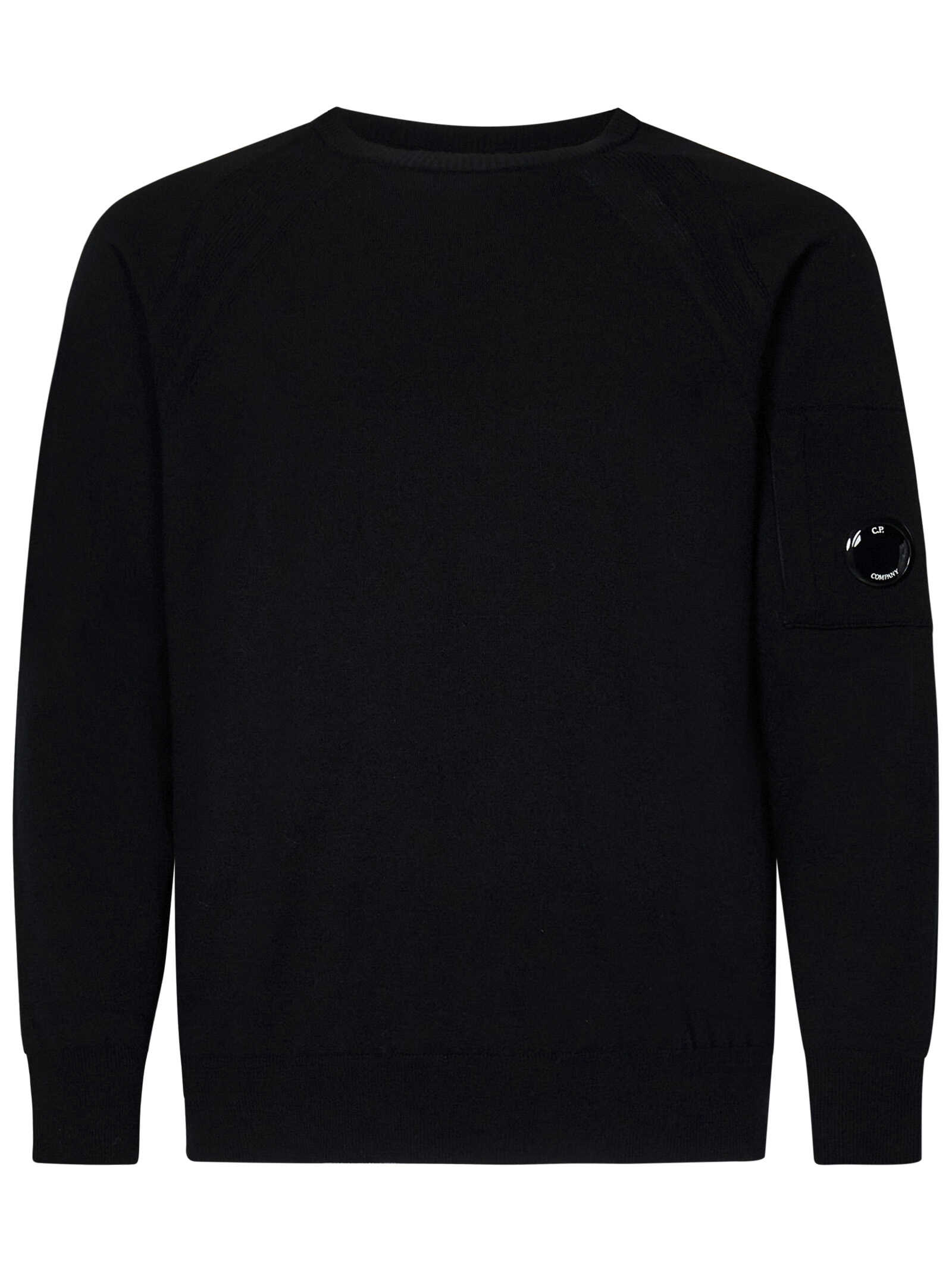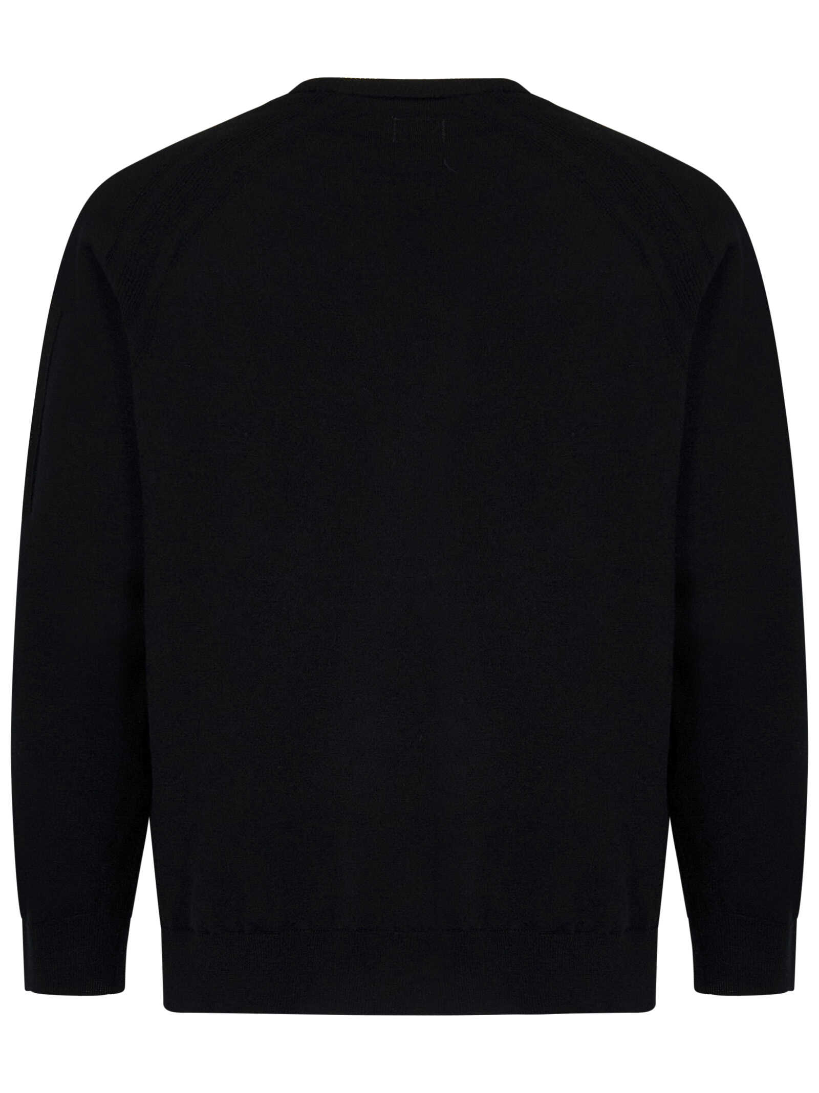 Black virgin wool blend knit crewneck sweater with Lens detail at sleeve.