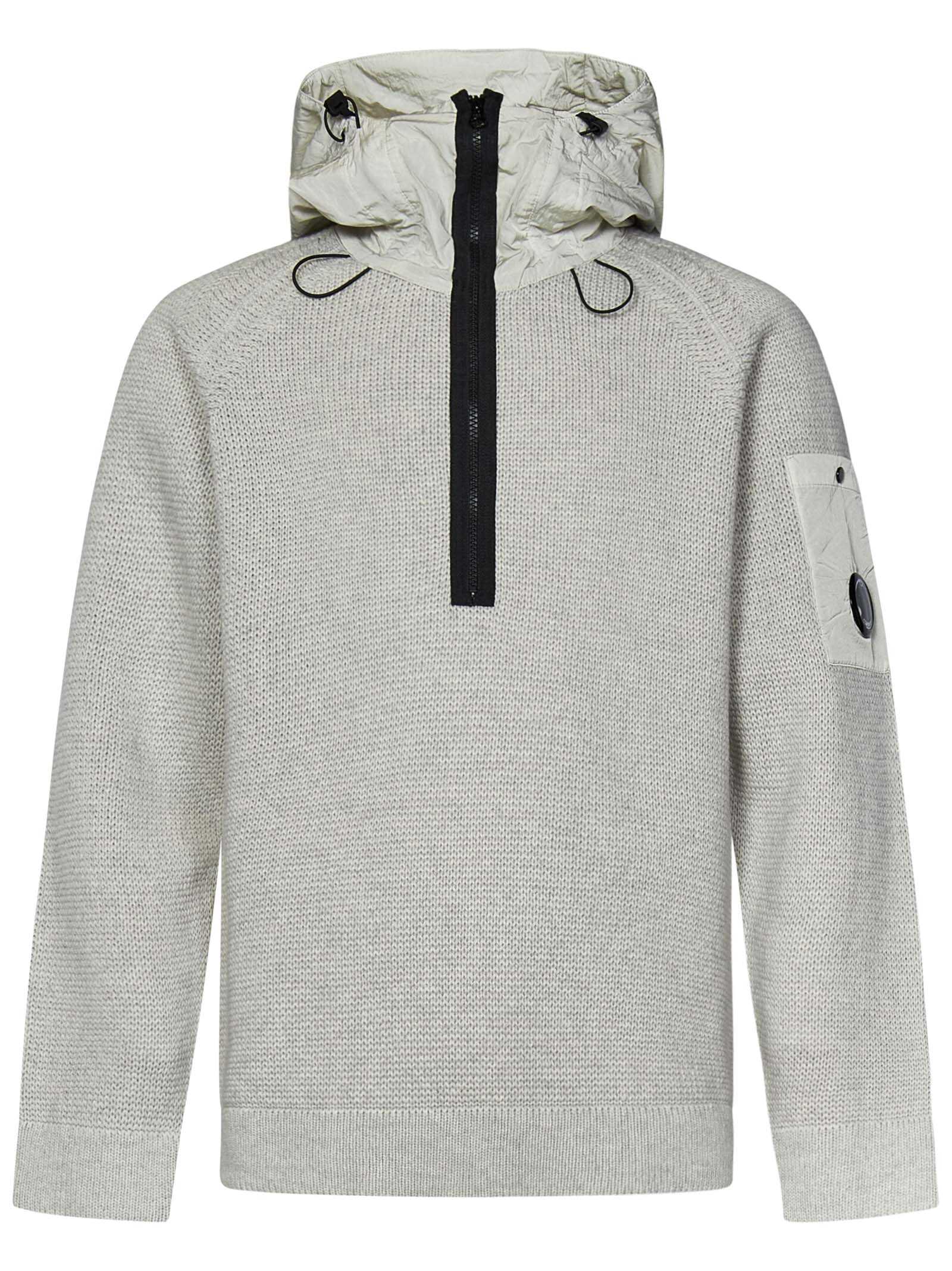 Off-white wool sweater with Eco-Chrome hood and lens on the left sleeve.
