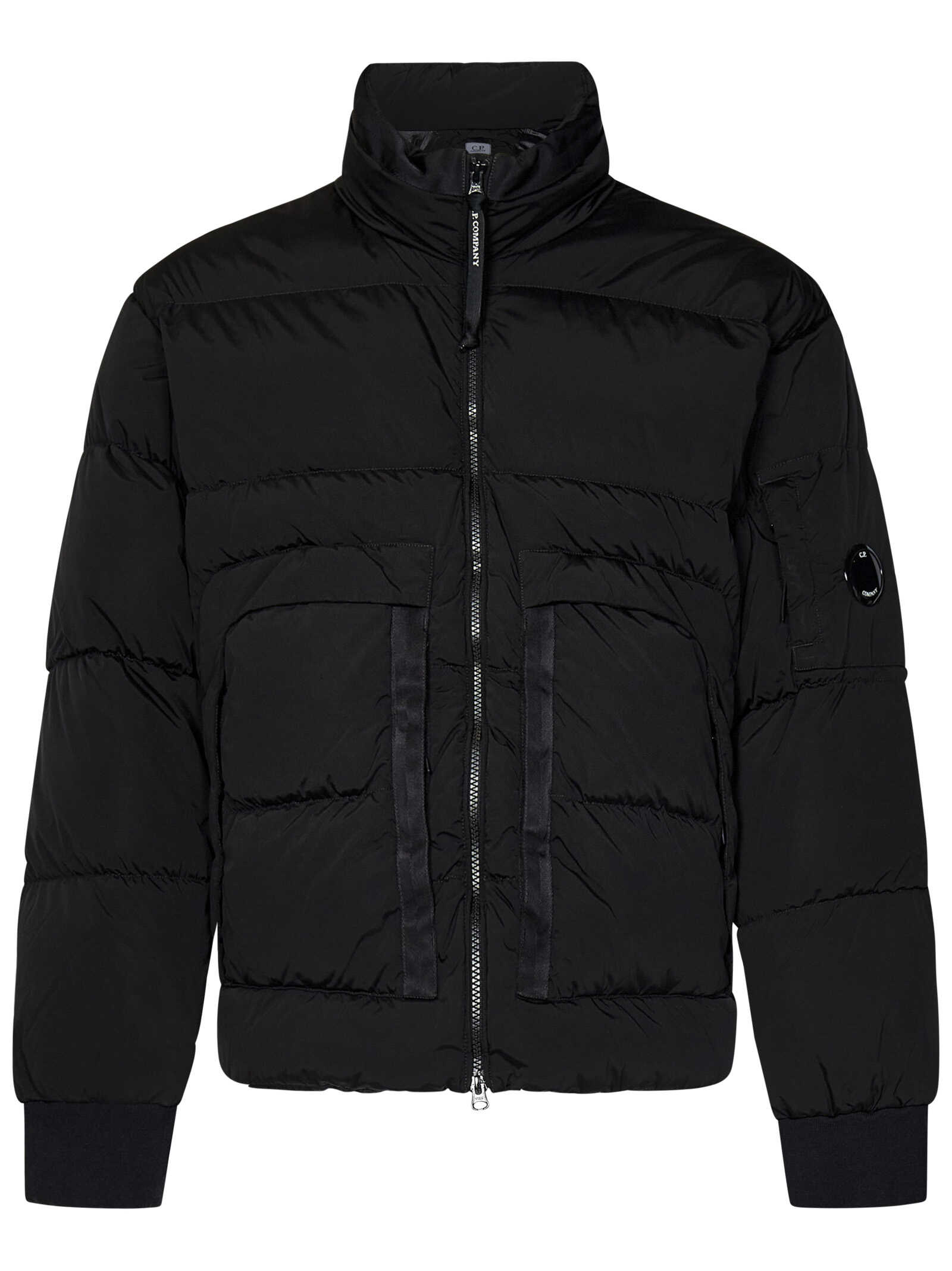 Quilted black nylon high-neck down jacket with Lens detail on the left sleeve.