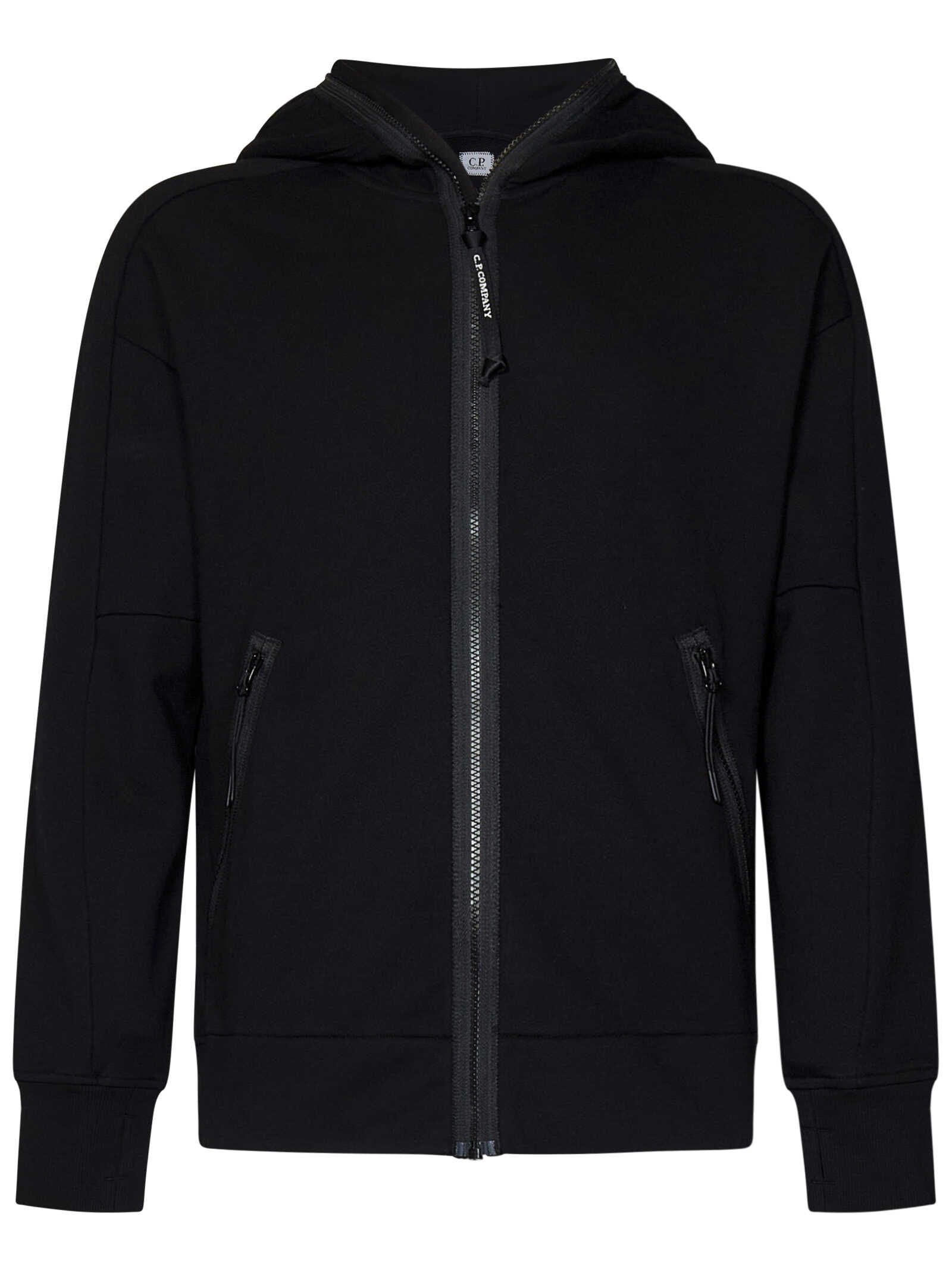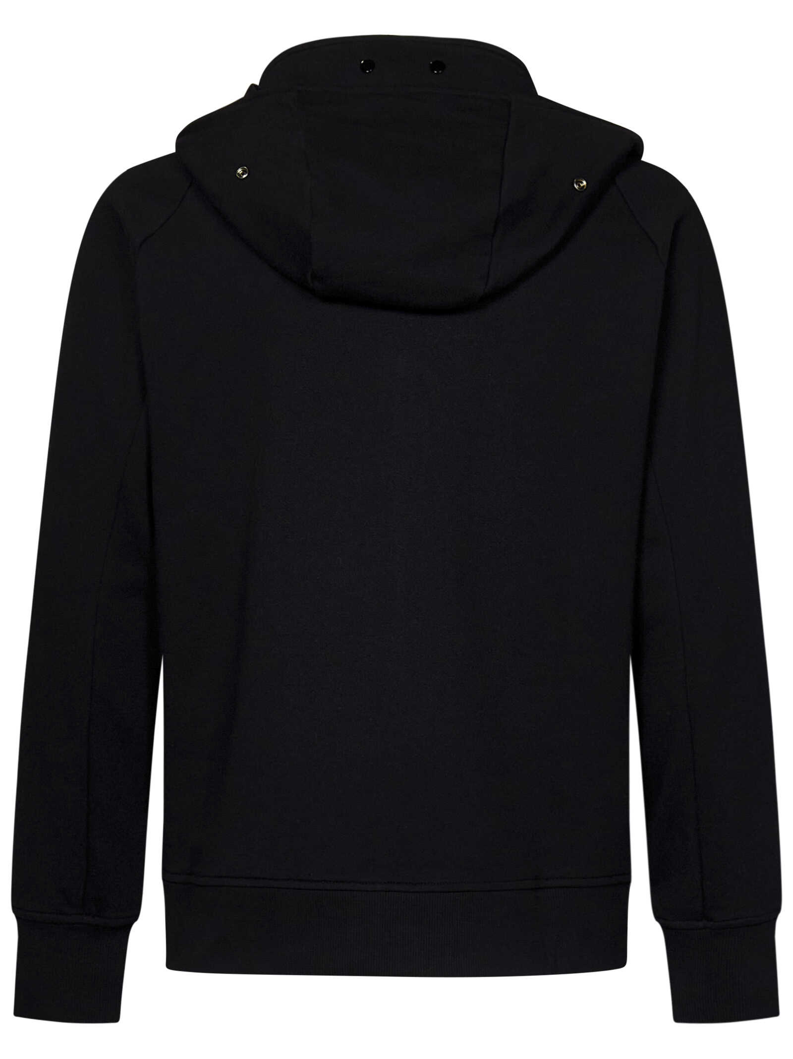 Black mid-weight cotton zip-up sweatshirt with Goggle hood.