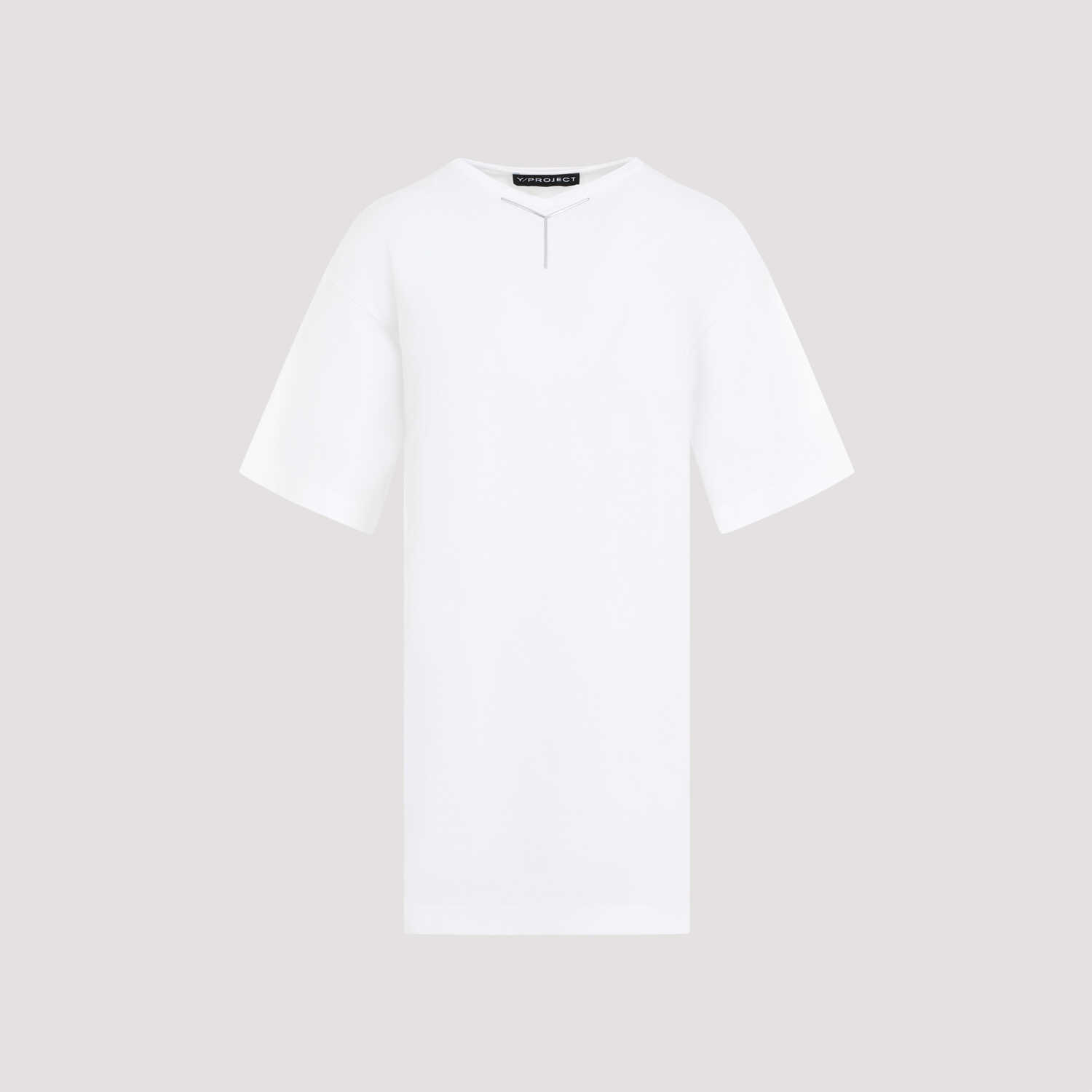 Elevate your wardrobe with this Y Project 204TS006.J135 t-shirt. Made from 100% cotton, this optic white tee features a soft v-neckline with a silver-tone Y-shaped plaque, dropped shoulders, oversized short sleeves, and a straight hem. Perfect for adding a touch of luxury to your everyday look.