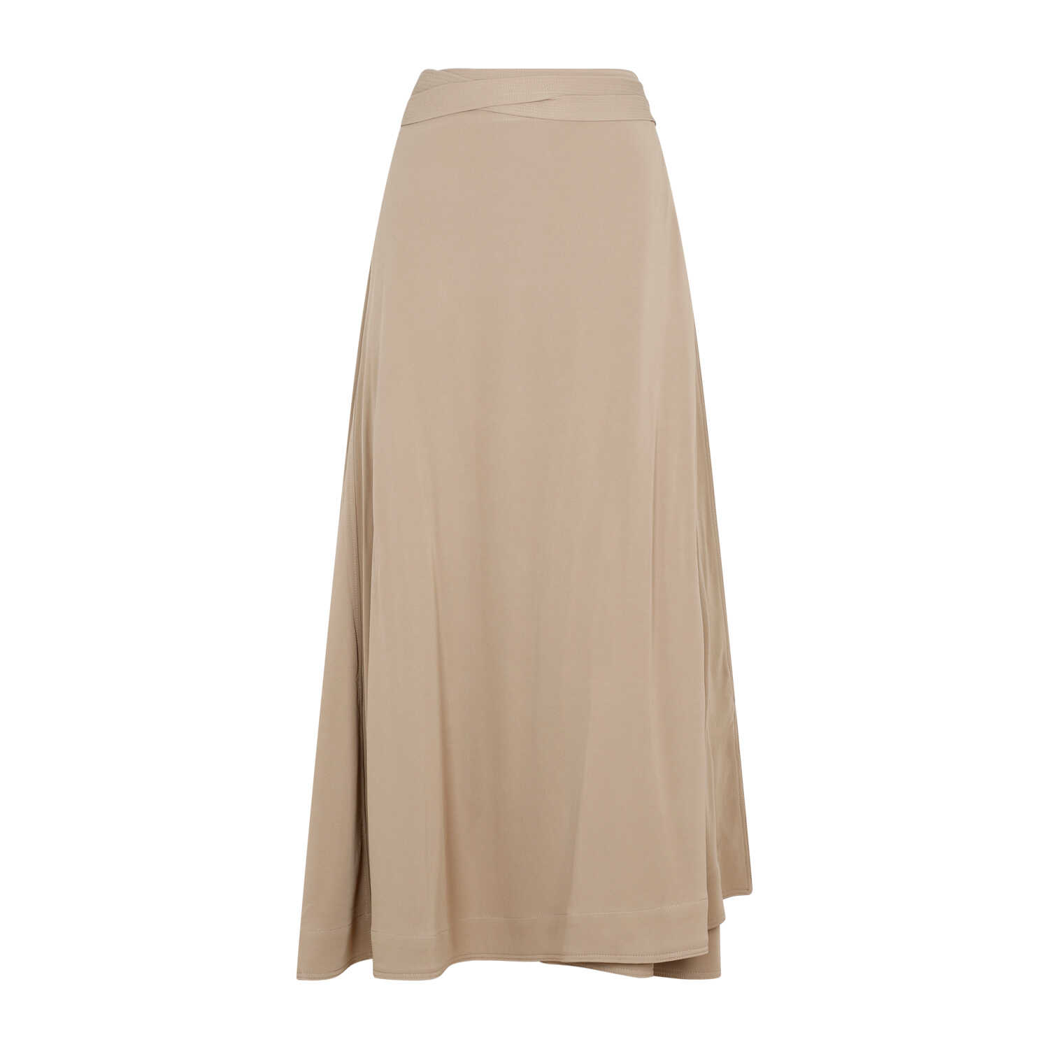 Toteme Beige Tie-Waist Wrap Skirt. beige viscose blend, self-tie waist, long length, tonal stitching, regular fit.