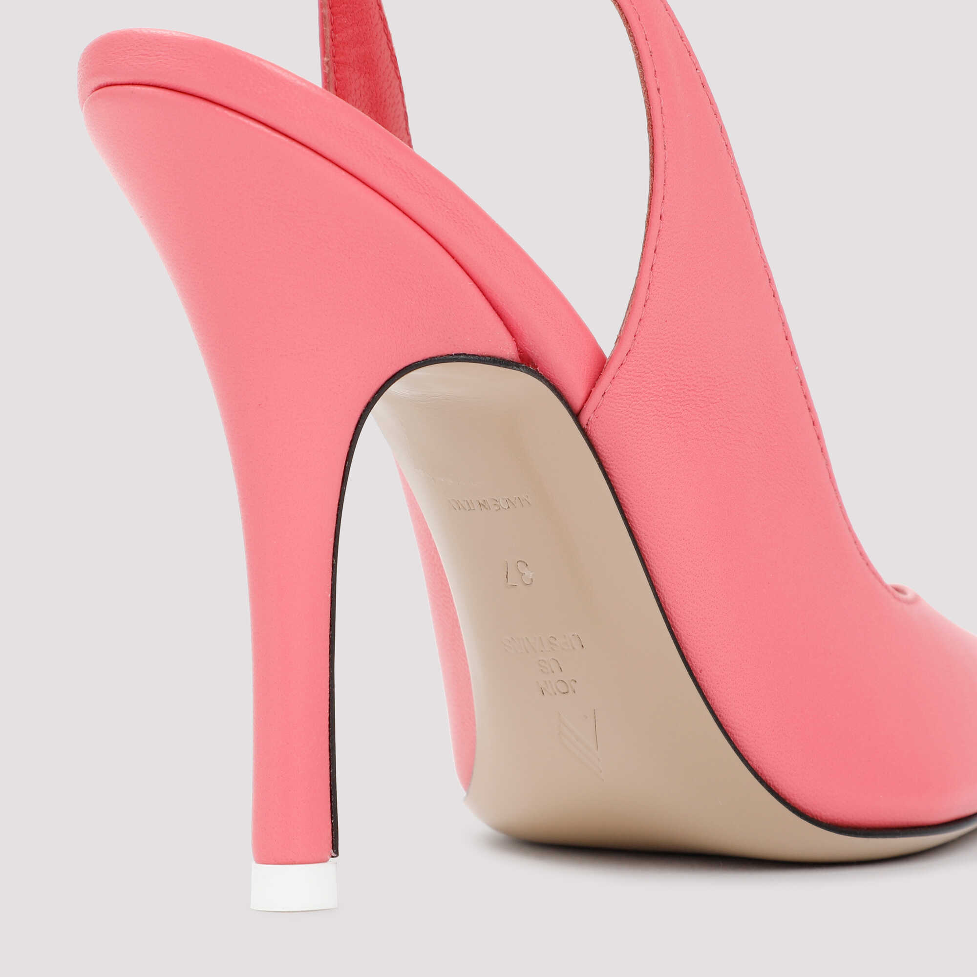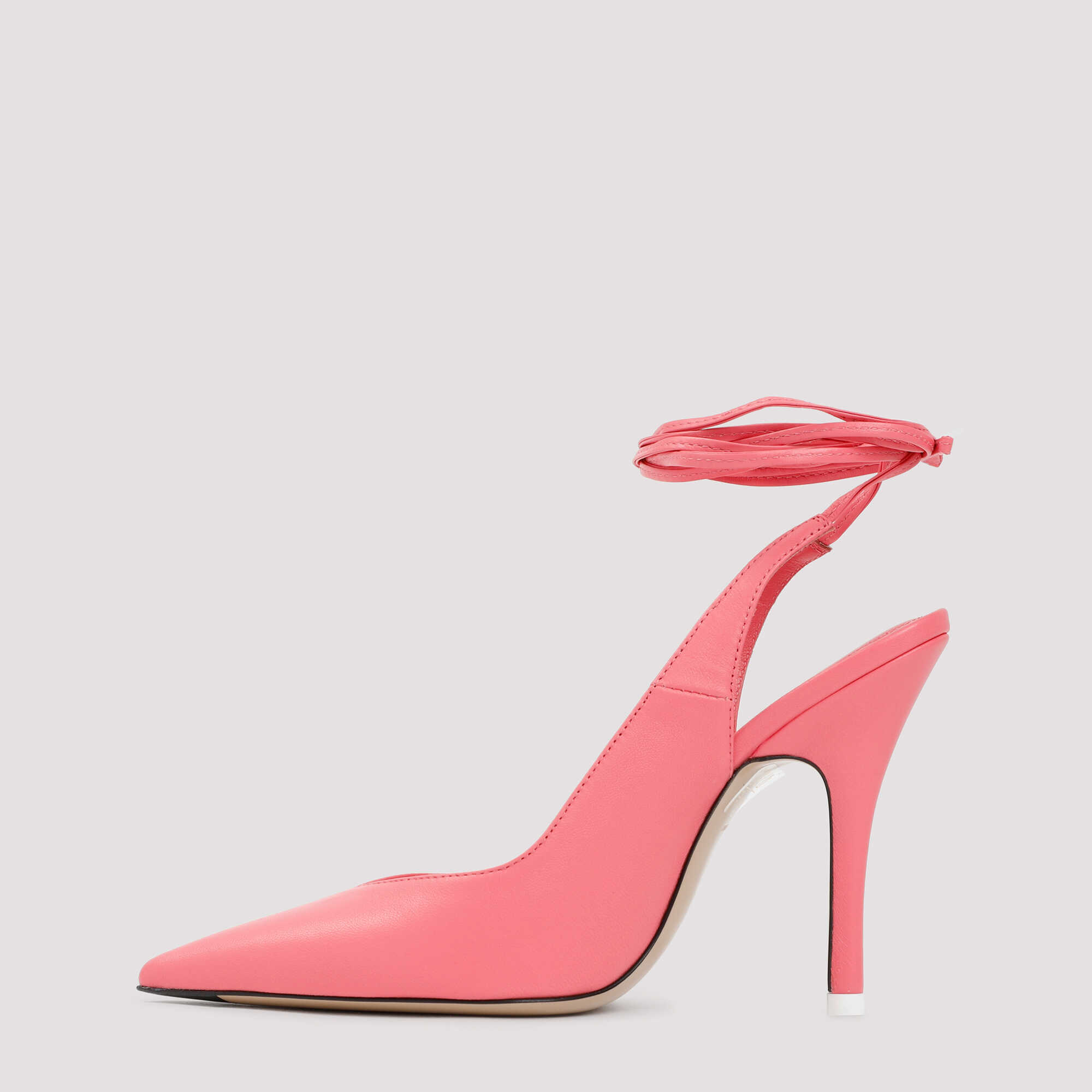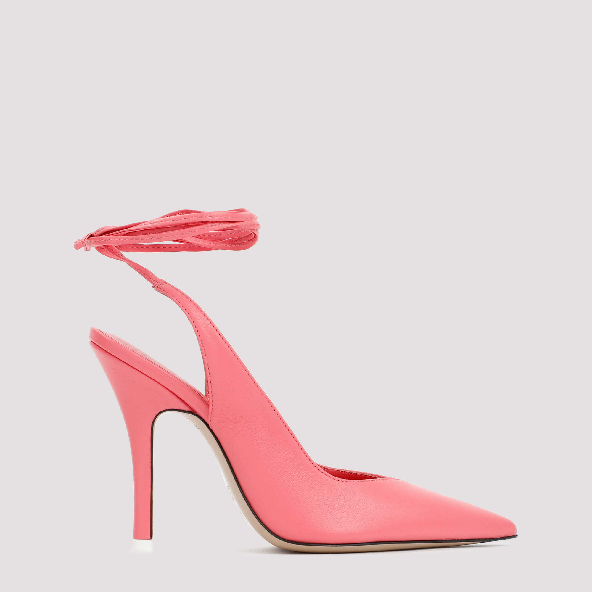 The Attico Peach Leather Venus Slingback Pumps. Upper crafted in pure peach nappa leather. Pointed toe, V-shaped vamp, covered stiletto heel, slingback construction, self-tie ankle straps fastening, logoed insole, leather outsole.