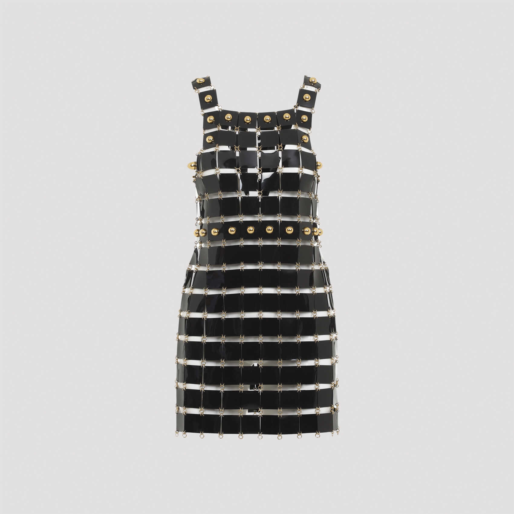 Feel like a modern goddess in this stunning black dress by Rabanne. Made from high-quality vinyl with steel and iron details, this mini-length dress features a squared neck and sleeveless design. The gold-tone accents add a touch of luxury, while the fully lined white jumpsuit underneath ensures comfort and coverage. Perfect for a special evening out, this dress will make you stand out from the crowd with its unique and bold style. Elevate your look with Rabanne.