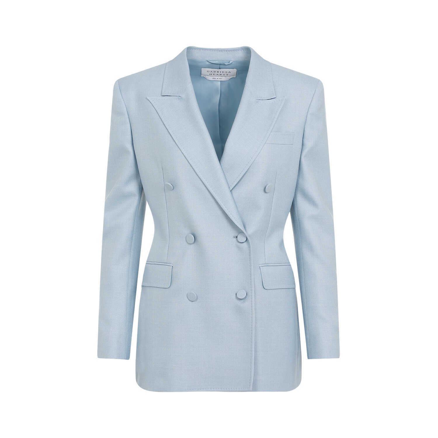 Make a statement with this luxurious Gabriela Hearst stone blue silk Gavin blazer. Expertly crafted in a silk and virgin wool blend, featuring a notched collar, double-breasted design, and side flap pockets. Elevate your look with this timeless piece. Limited availability, order now!