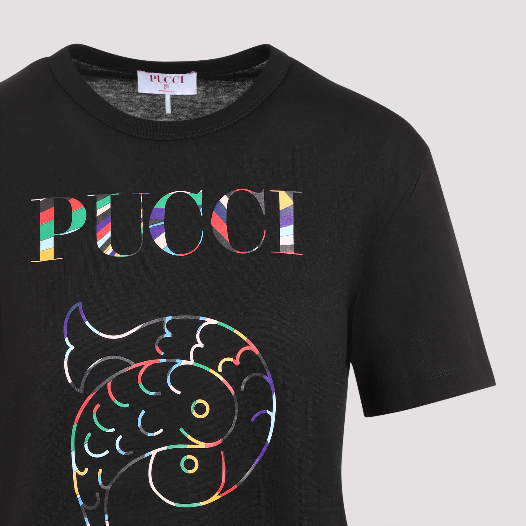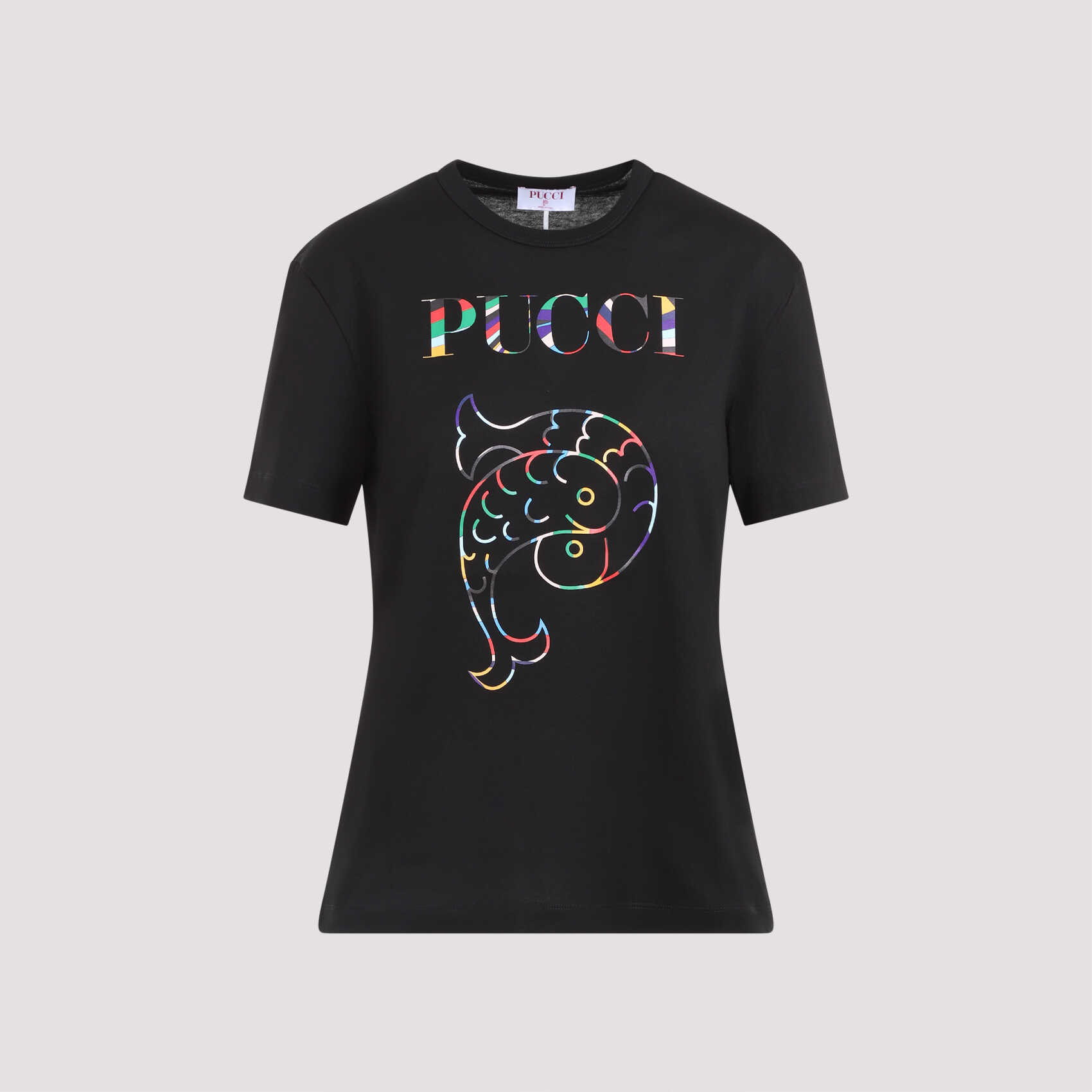 Pucci Black Cotton Short Sleeves T-Shirt. Pure black cotton t-shirt, round neck, front lettering logo, front fish signature logo, tonal stitching, straight hem.