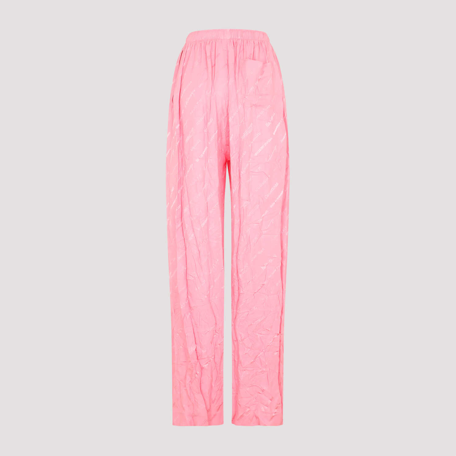 Balenciaga Pink Silk Logoed Pants. Pink silk, logoed pattern all over, wide legs, elastic waistband, front logo patch, 3-pocket style. Relaxed fit.