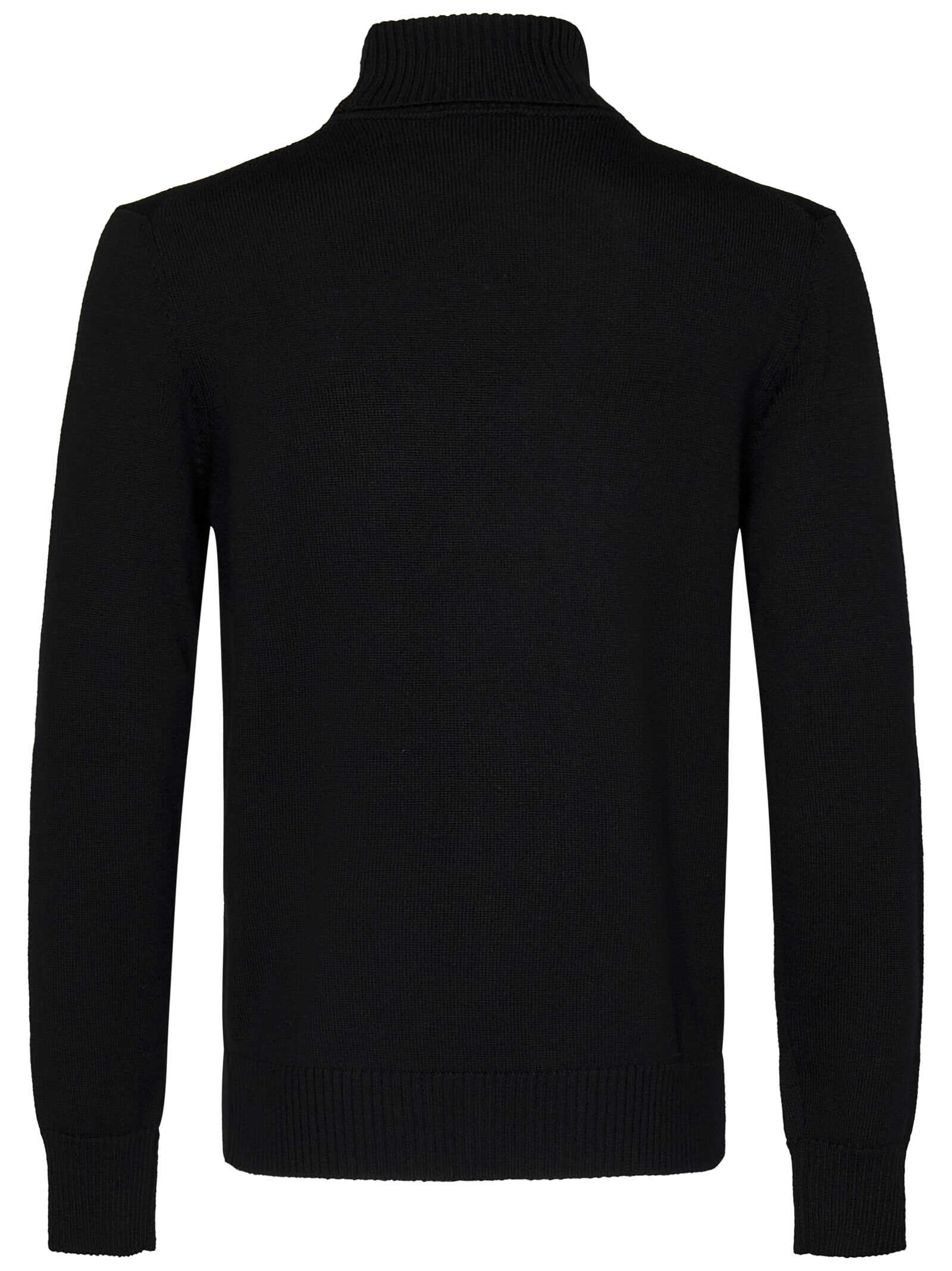 Black virgin wool knit turtleneck sweater with ribbed trim.
