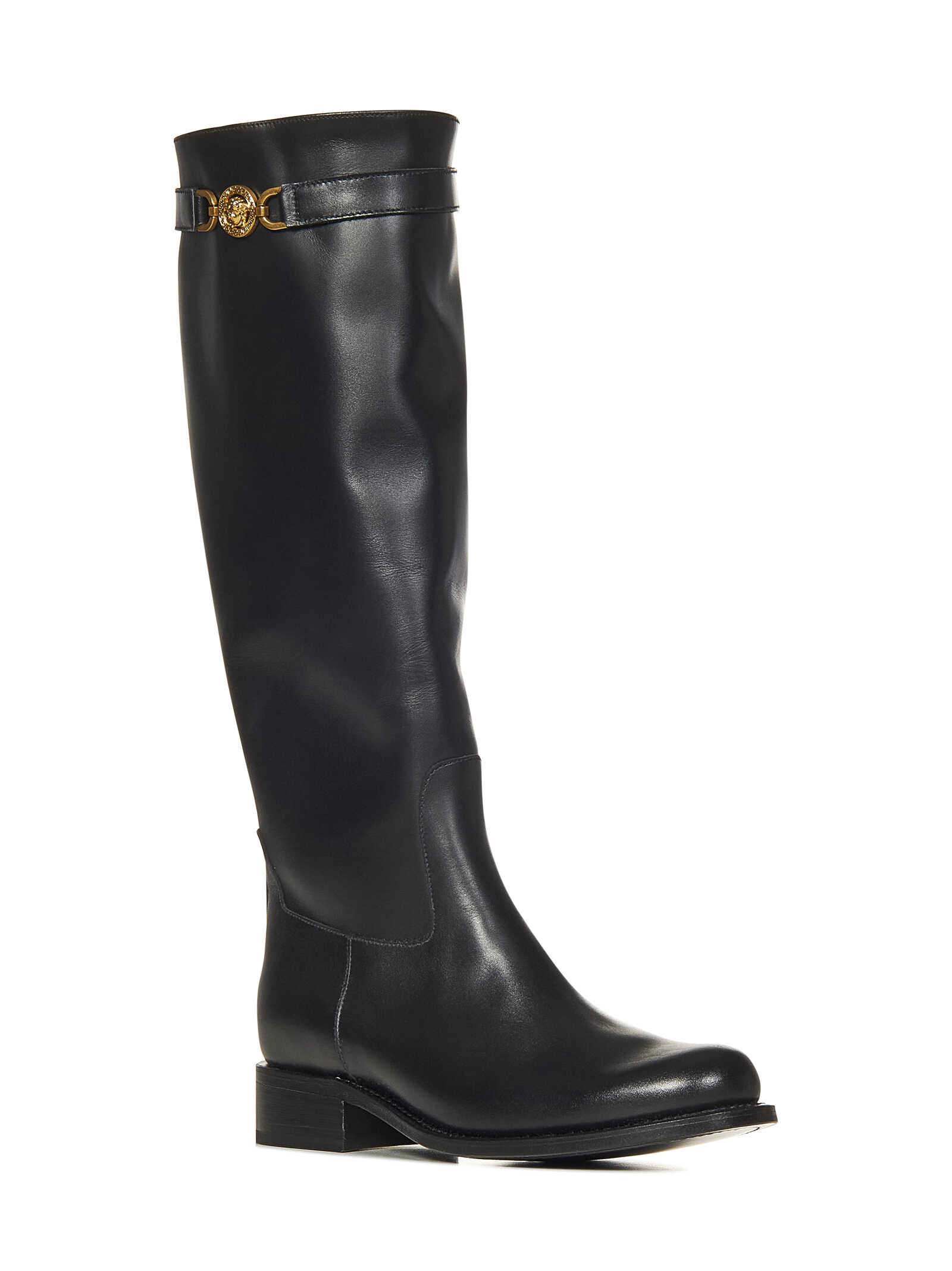 Black smooth leather knee-high boots with gold-tone Medusa '95 belt and buckle.
