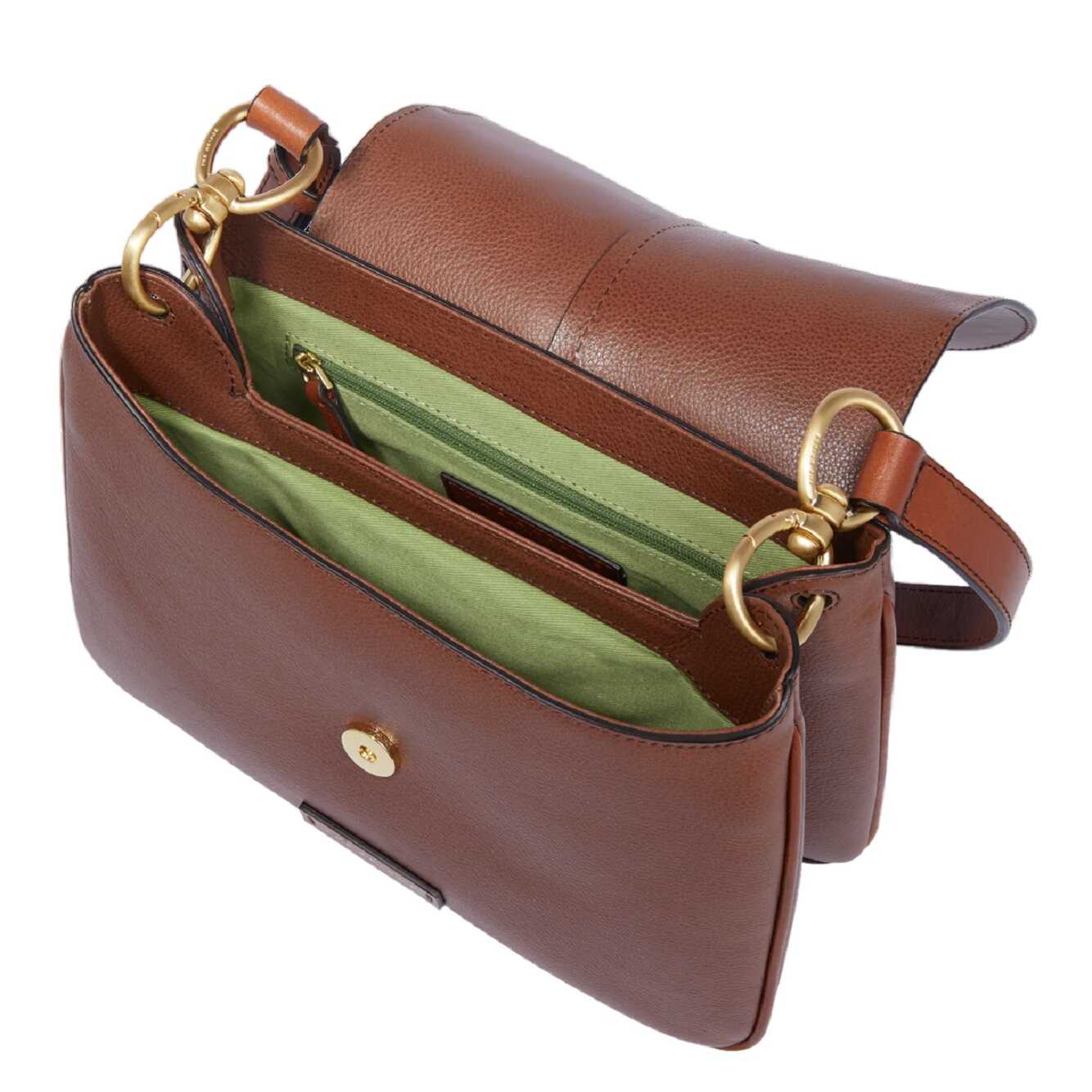 Elevate your style with this exquisite brown leather shoulder bag from THE BRIDGE. With its elegant gold accents, spacious compartments, and durable fabric lining, this bag beautifully balances fashion and functionality for the modern woman.