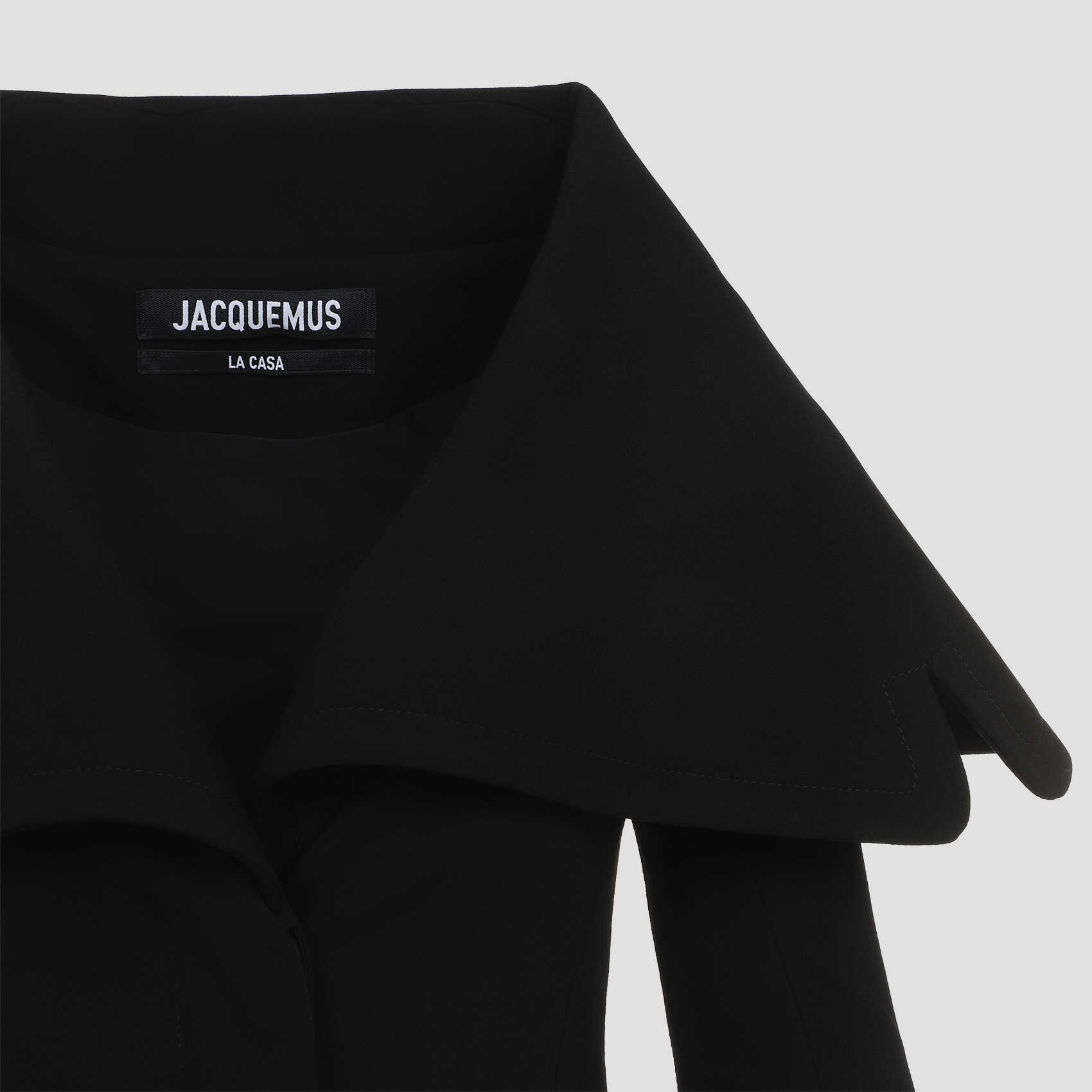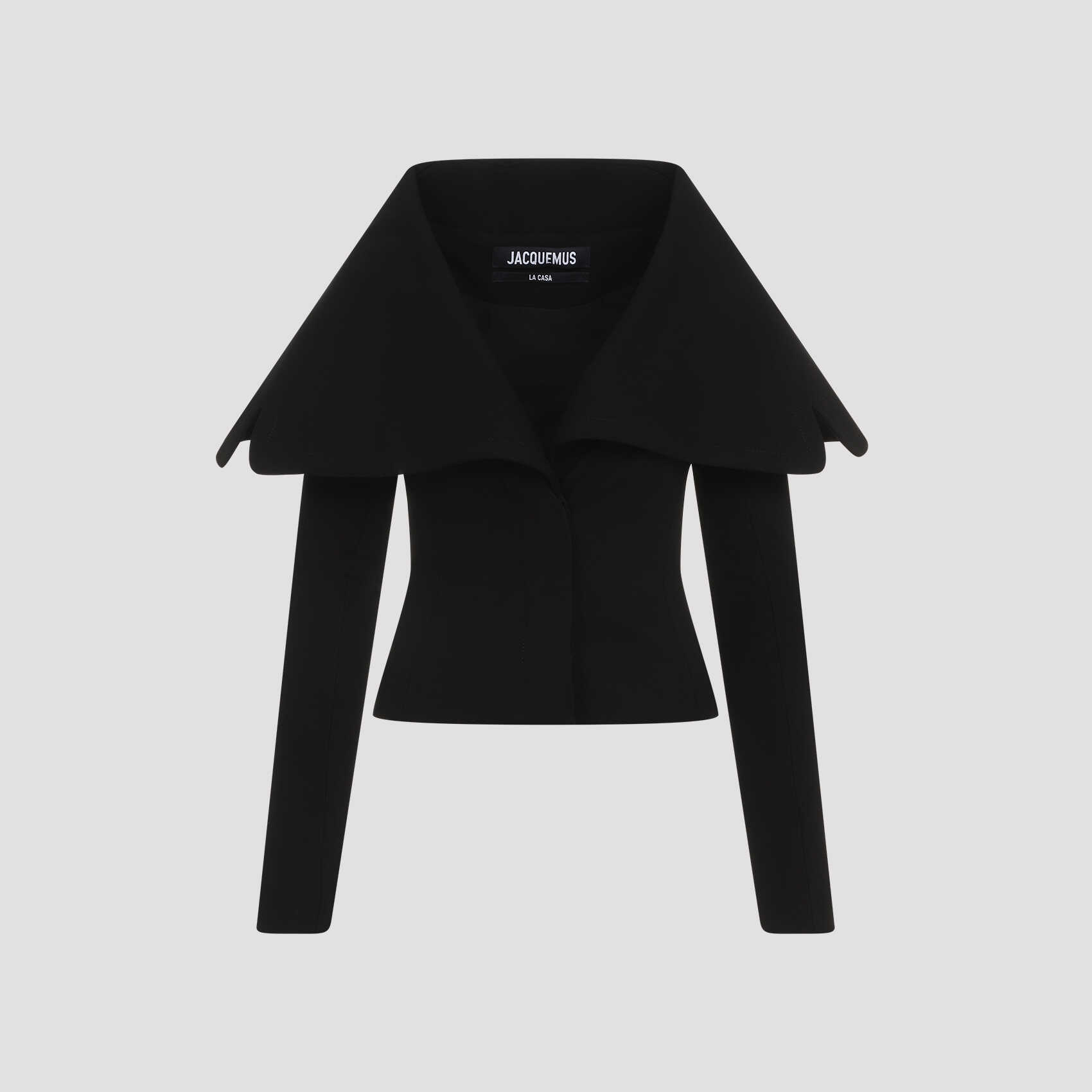 Elevate your style with this sleek black JACQUEMUS jacket. Made from a luxurious blend of cotton, acetate, and elastane, this jacket is perfect for any occasion. The unique design and high-quality material make it a must-have for any fashion-forward woman. Add a touch of sophistication to your wardrobe with this statement piece.