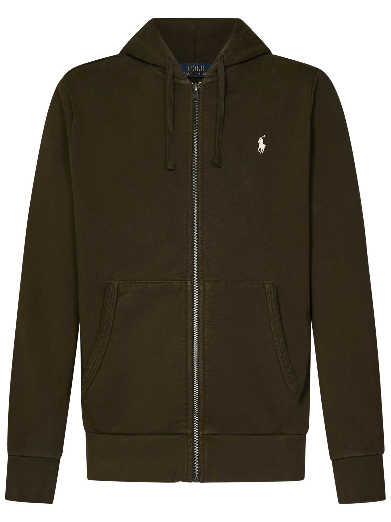 Military olive cotton zip-up hoodie with Pony embroidery at chest.