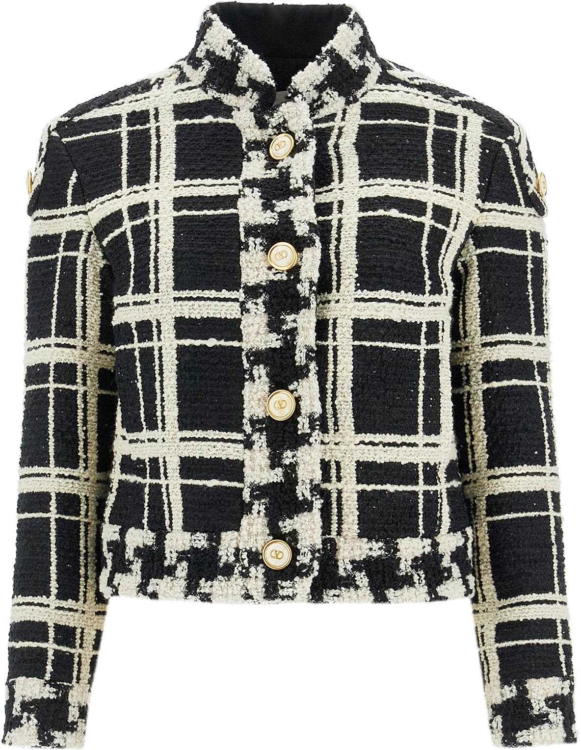 Valentino jacket made of macro check tweed in a wool blend, with front closure featuring VLogo buttons, side pockets and jacquard lining with diagonal stripe pattern and flowers with VLogo. The model is 177 cm tall and wears size IT 40.