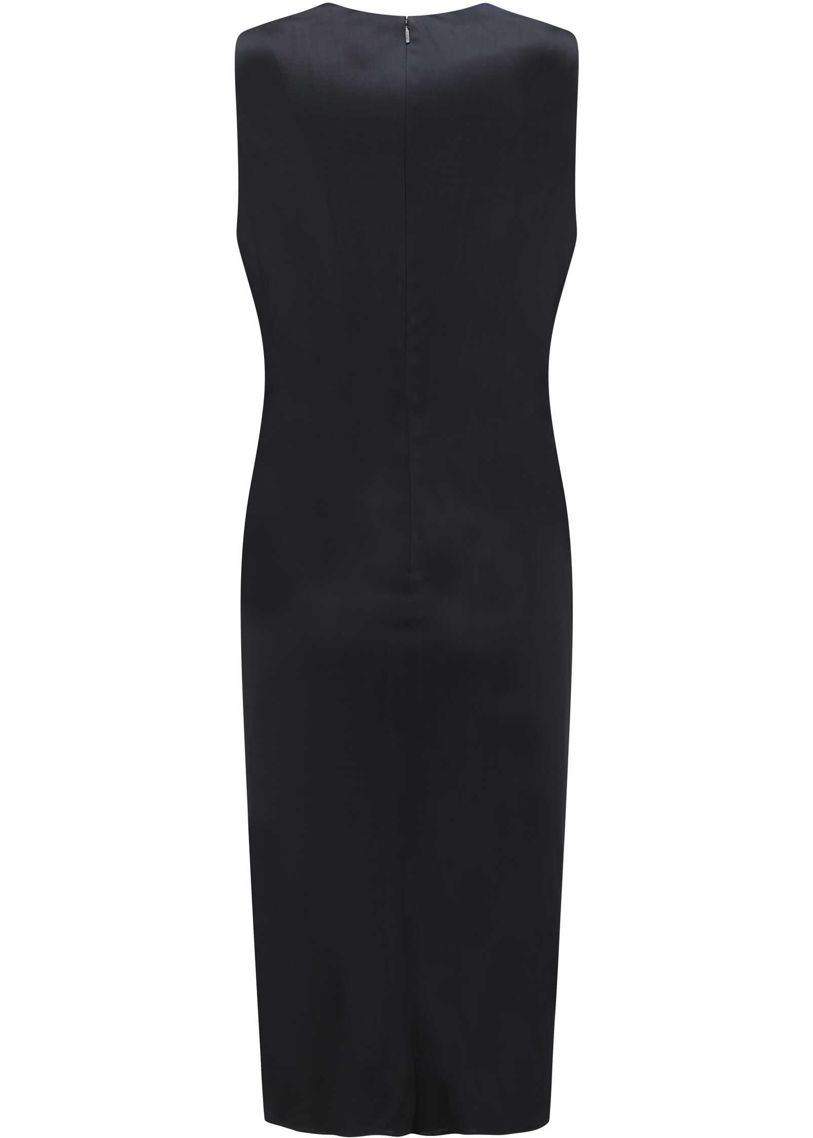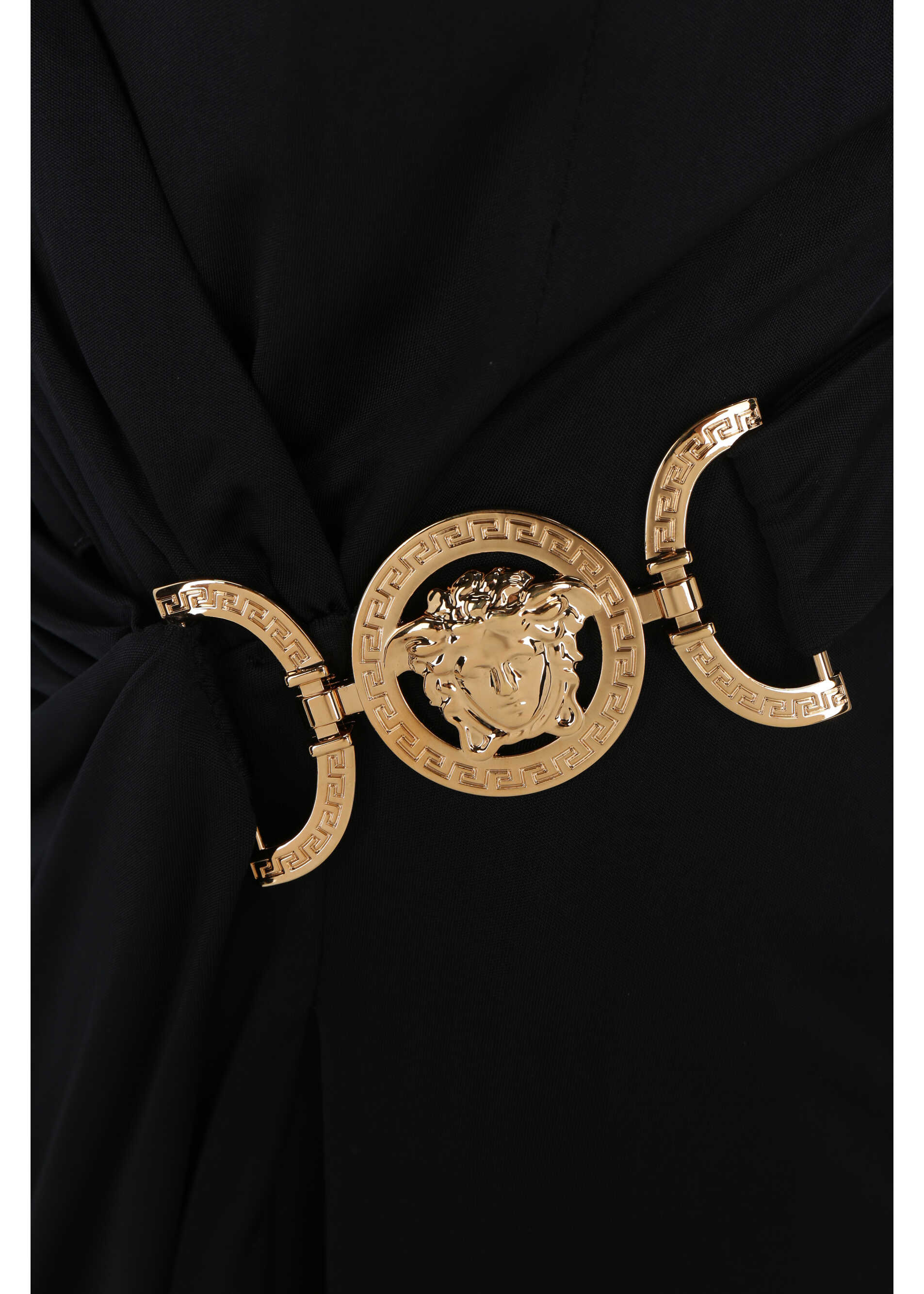 Dress by Versace, satin finish, V-neck on front, back zip fastening, crossover design on front, wide slit on front, three-dimensional plaque with iconic branded medusa applied on front, regular fit.