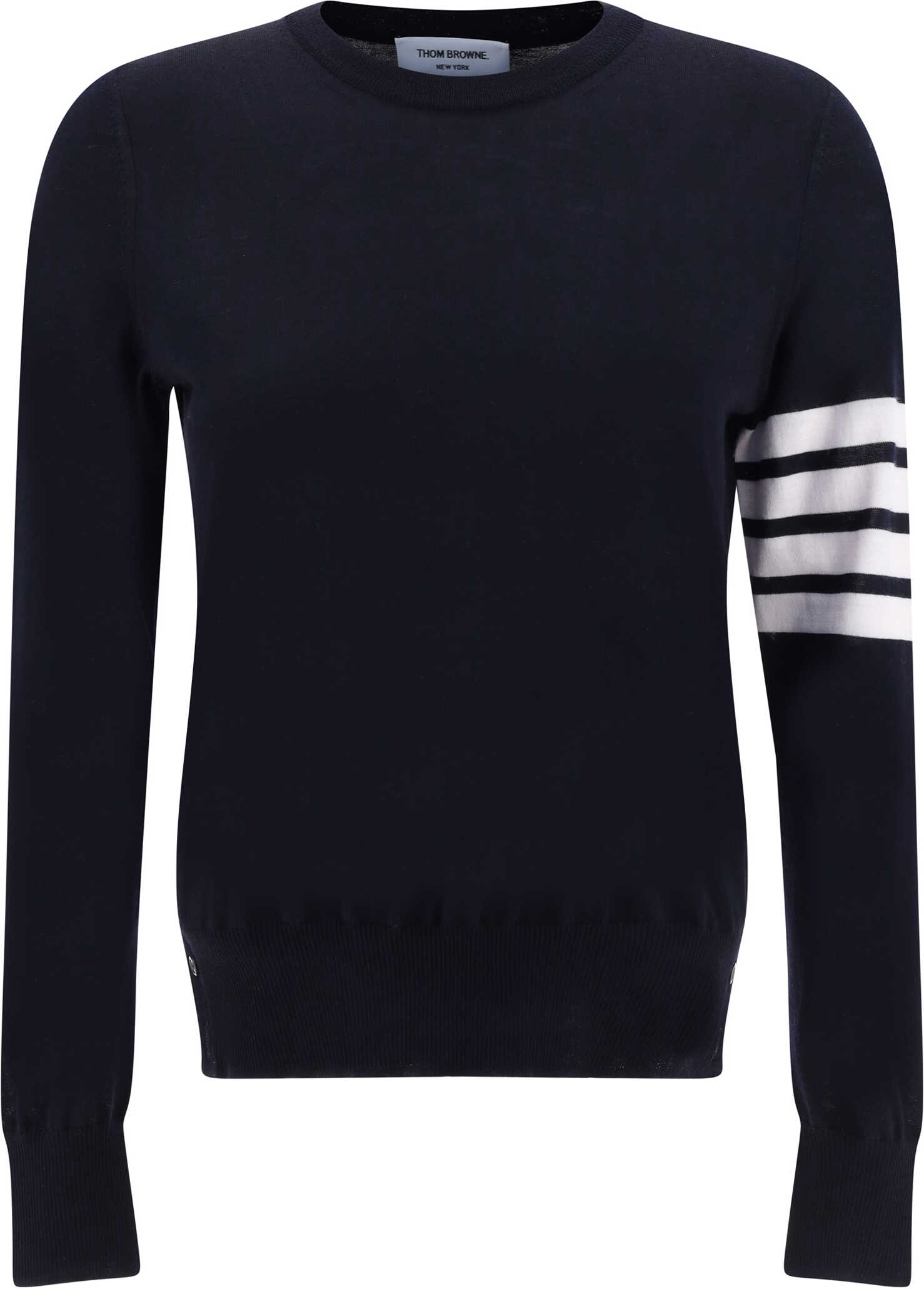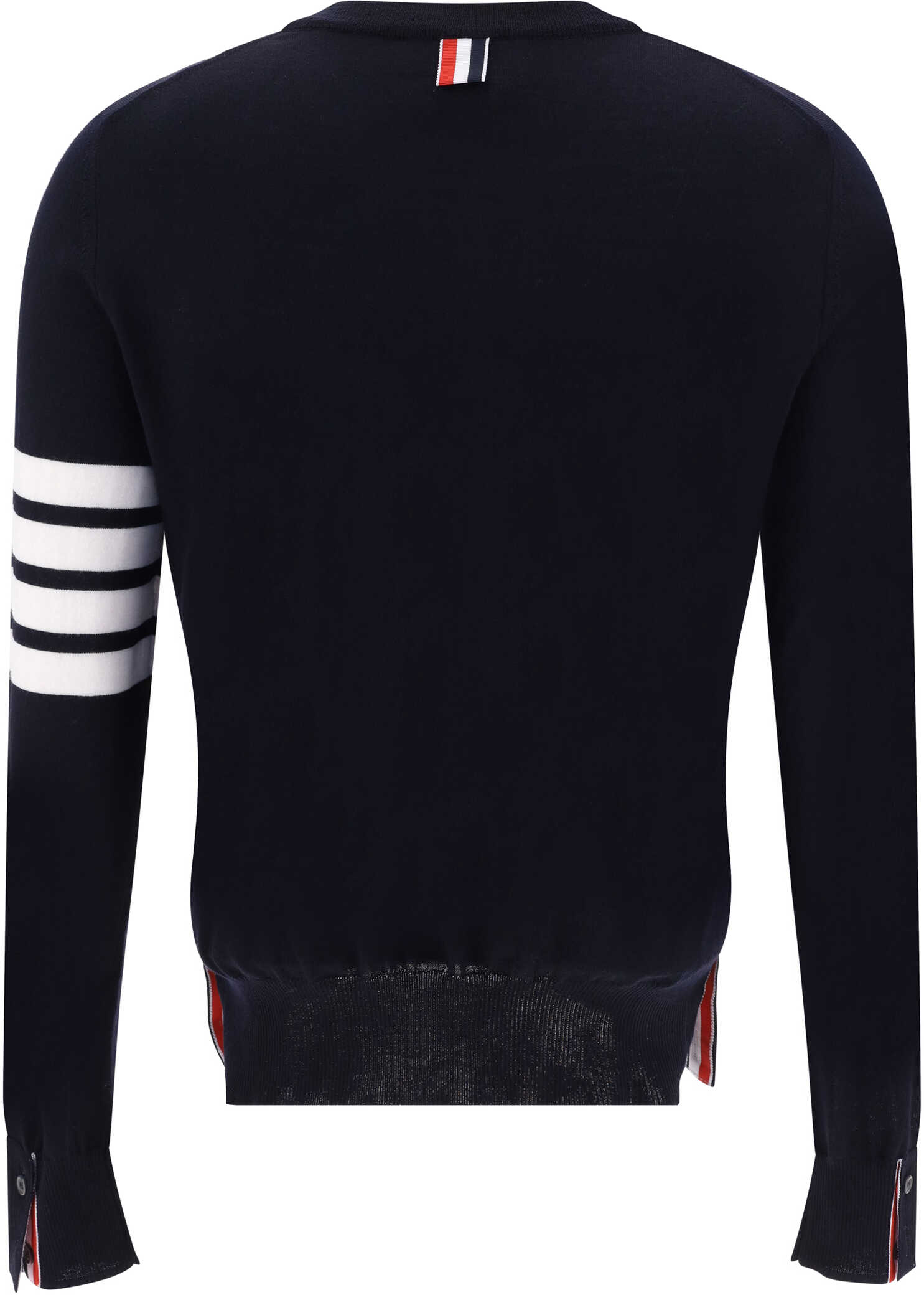 Fleece Wool Sweater by Thom Browne, ribbed crew neck, ribbed hem with side buttons to adjust slits, ribbed cuffs with buttons, slim fit, iconic brand horizontal stripes on left arm.