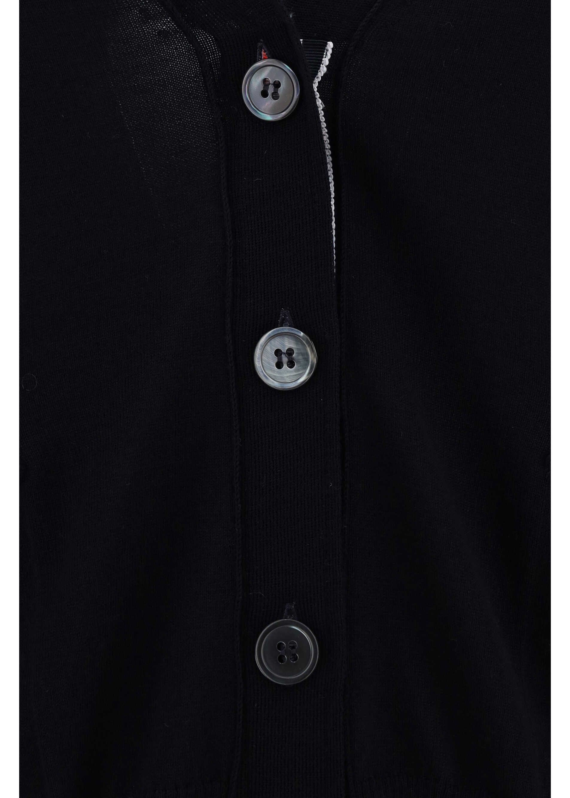 Thom Browne Cardigan made of soft merino wool, featuring a monochrome design and slim fit. Featuring a V-neck with ribbed trim, it has a front button closure and two patch pockets on the front. The brand's iconic horizontal bands decorate the left arm, adding a distinctive touch. Slight adjustable side slits with buttons complete the garment, for greater freedom of movement. A refined and versatile garment, perfect for smart or casual looks.